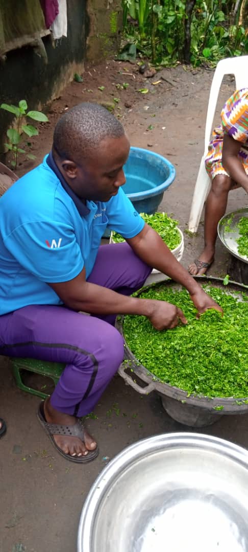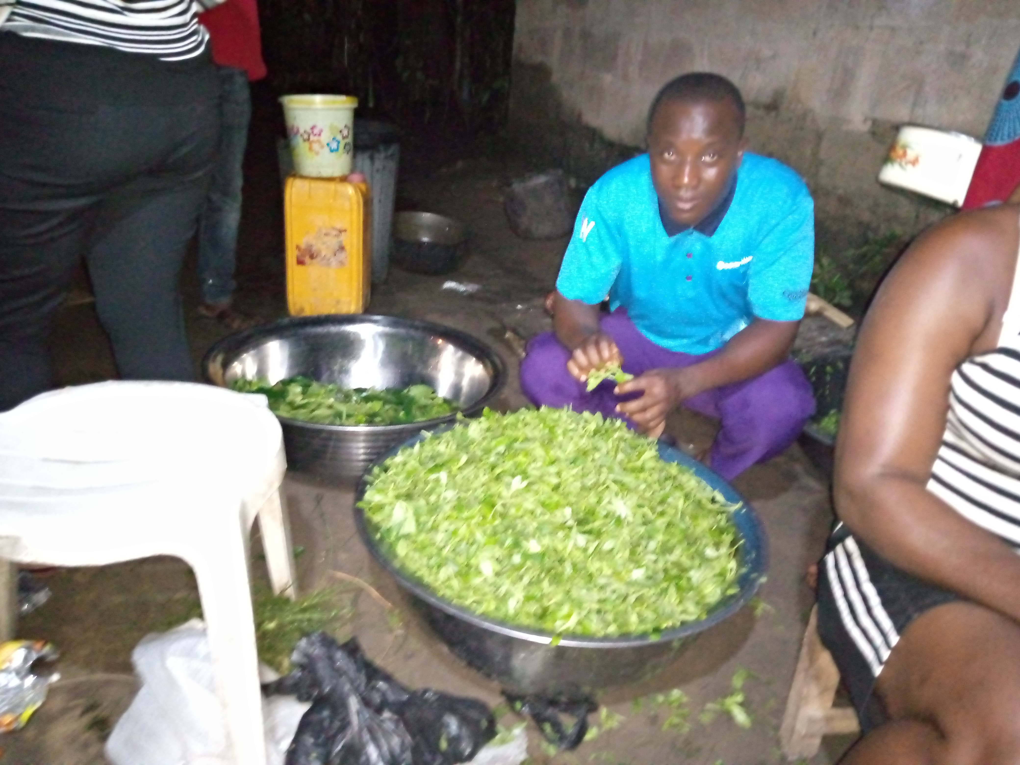 I begin with giving thourogh wash of the water leaf and pumpkin leave,,I selected the water leaf removed the flowers and wash , I chop the water leaf.seperately and the pumpkin.make fire from a local port stand.with firewood,put the pot on fire put oil on it when the oil is hot to a degree I added solt and onions, fried the meat and fish,turn in the water leak and cover it after some minutes I put crayfish, paper ,and every condiments, cover it steam it to a proper degree,then I added pumpkin,and turn Palm oil on it,.I tested it it was wow.see the condiments and the process I took.cuting of water leave and cooking the food as well.