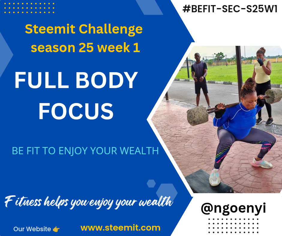 Dear fitness lovers, I warmly welcome you all to season 25 of this Steemit challenge. We are going to begin with week one which focuses on full body. This week's programs are designed in a way that it can appeal to everyone both old and young, beginners , intermediary and advanced and all who really want to stay healthy to enjoy their wealth. It is true that most users do not love fitness but I bet you, if you follow this season's fitness routine, you will surely achieve an unimaginable results.