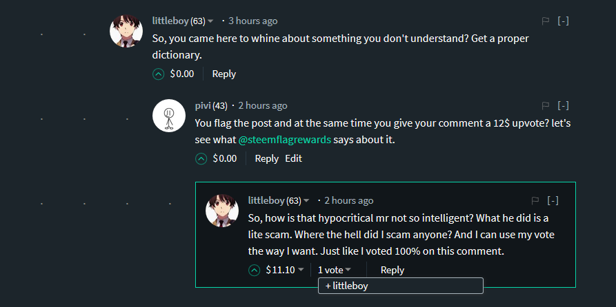 @littleboy flags steemlotteries and at the same time he upvotes his own comment on the post he flagged to get 10$+ out of it.