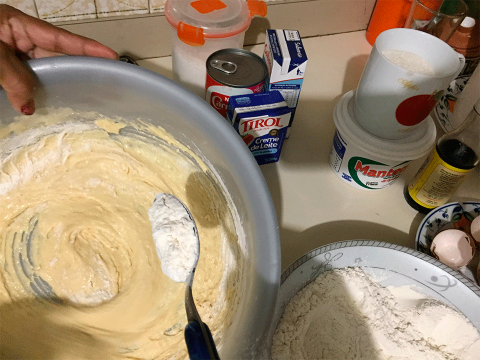 4. De manera pausada fui agregando la azúcar (pulverizada con la licuadora) y la harina de trigo que había colado previamente para retirar posibles formaciones con granulometría no deseada. Mezcla.png Se continúa batiendo de manera envolvente para ir incorporando la harina, azúcar y polvo de hornear hasta alcanzar la mezcla con textura y firmeza deseada.