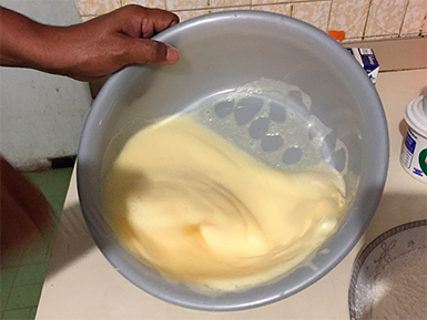 3. Formada la mezcla blanca espumosa, procedí a agregar las yemas de los huevos y la esencia de vainilla mientras continuaba batiendo hasta que los ingredientes lograran una mezcla homogénea.