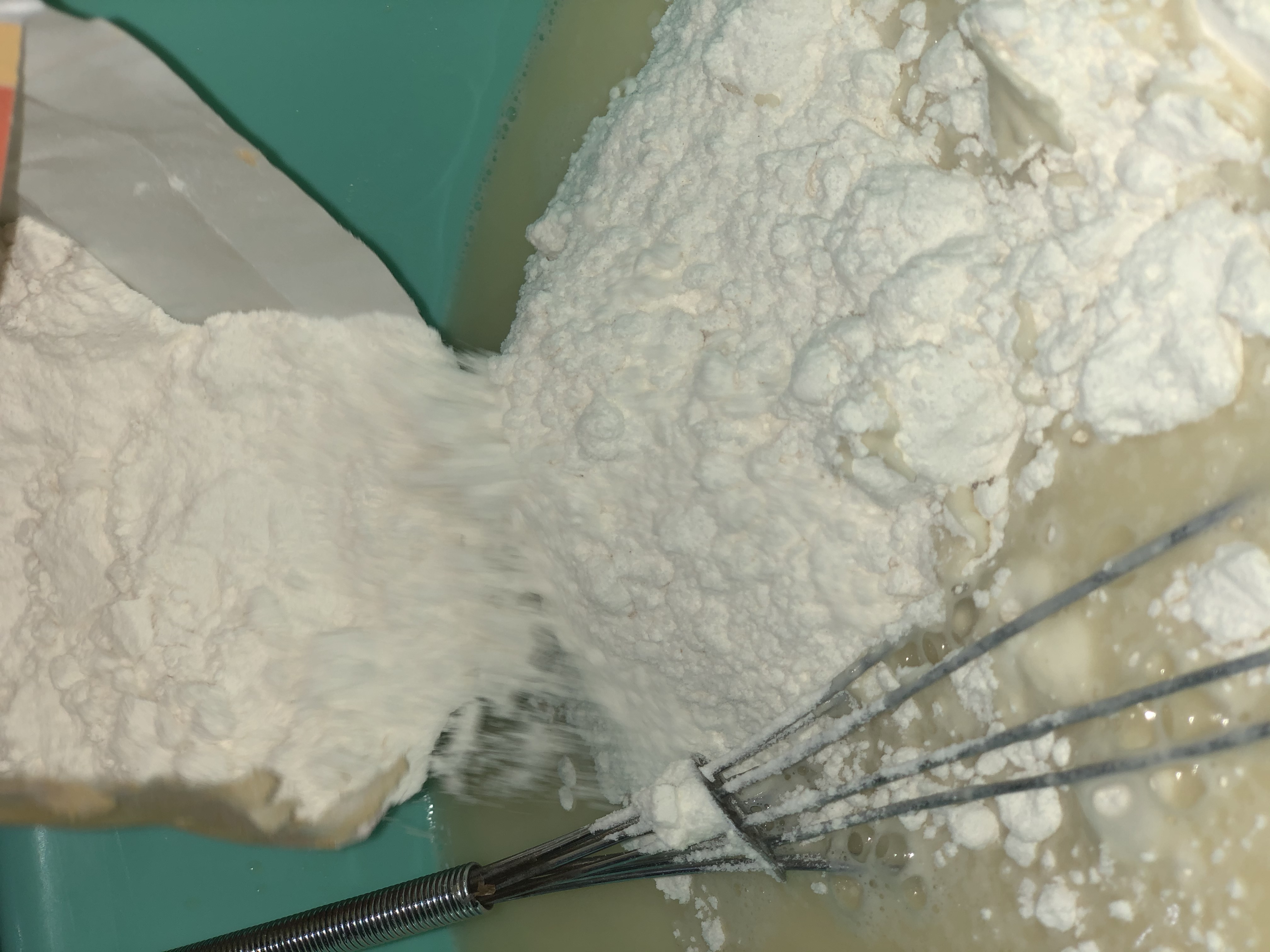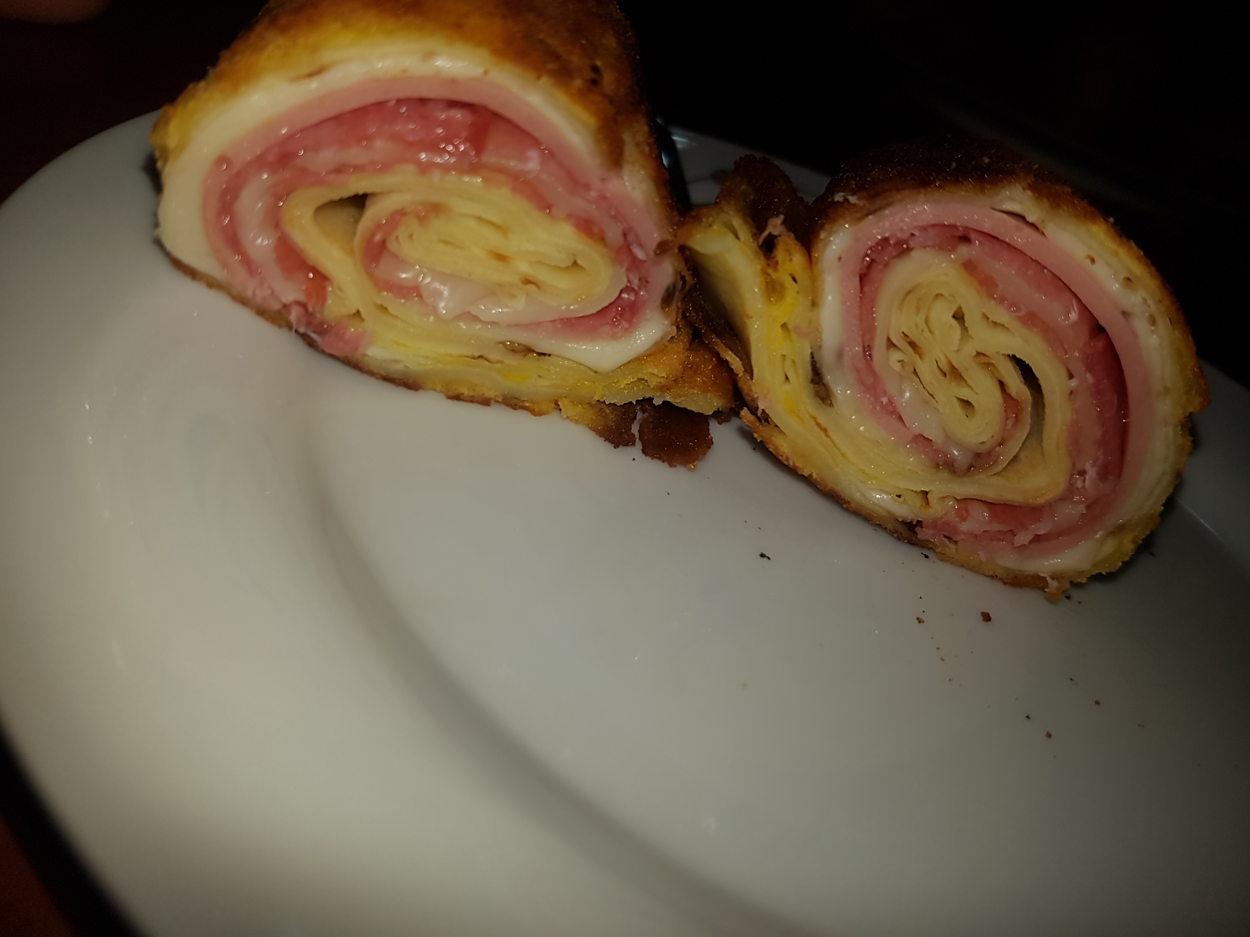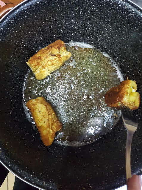 Then roll out the pancake and roll in flour, eggs and pretzels and fry in oil.