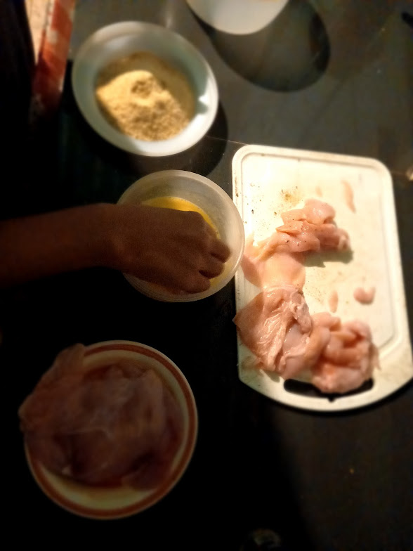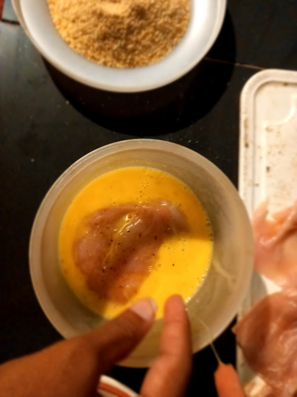 - 1 El primer paso es pre calentar el sarten con aceite, luego le agrego sal y pimienta al pollo, lo paso por el huevo batido por ambos lados y luego lo paso por el pan rallado