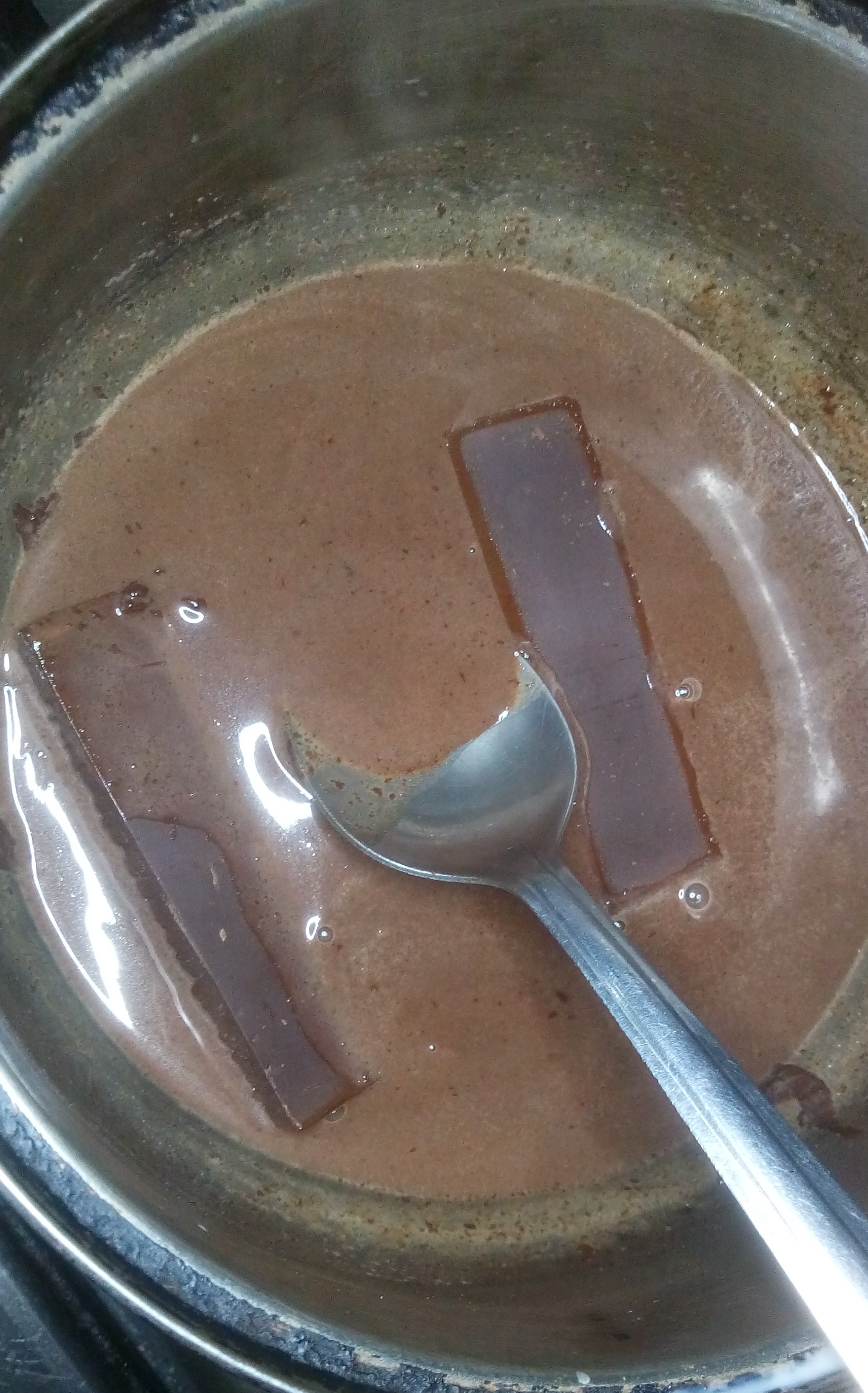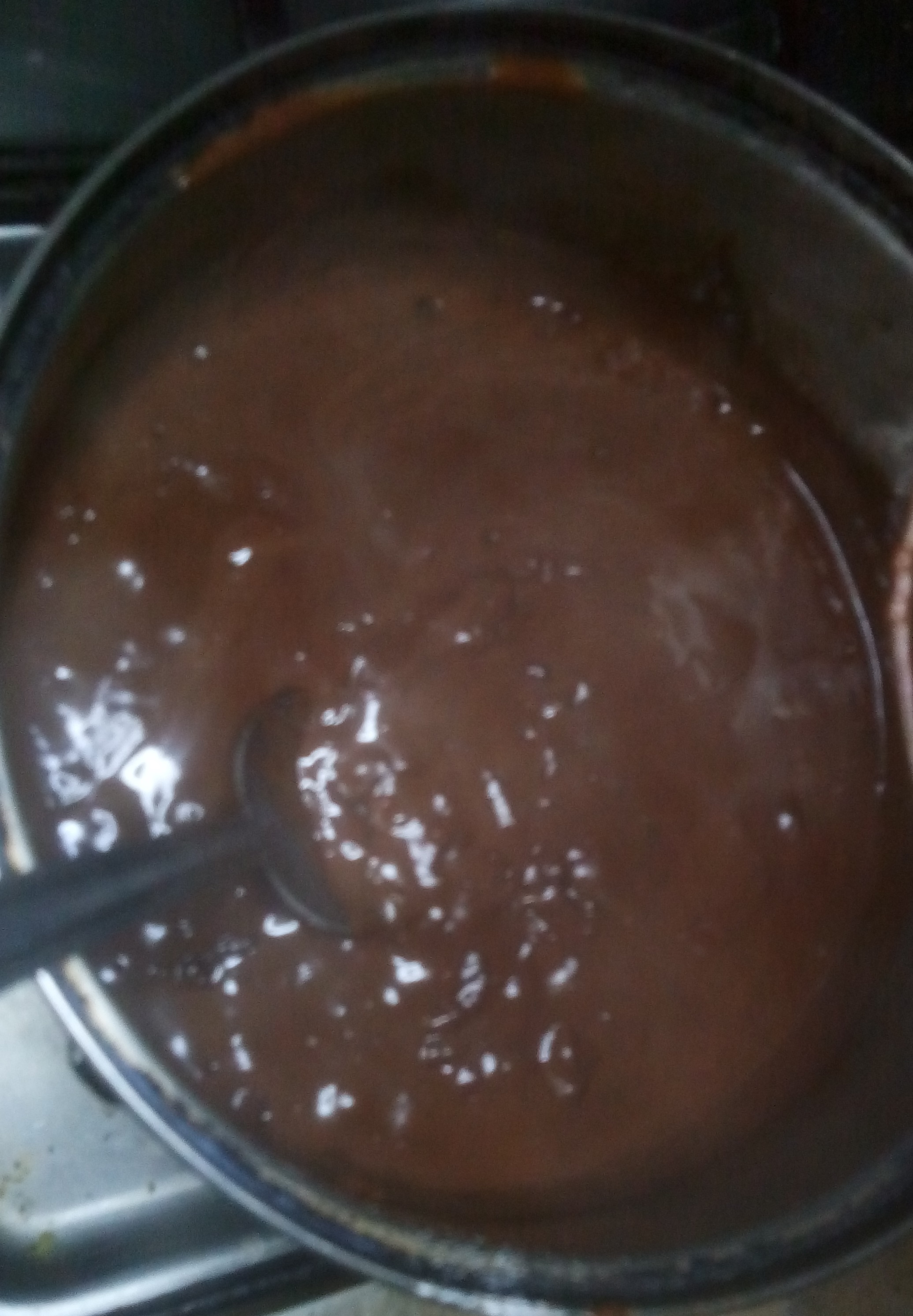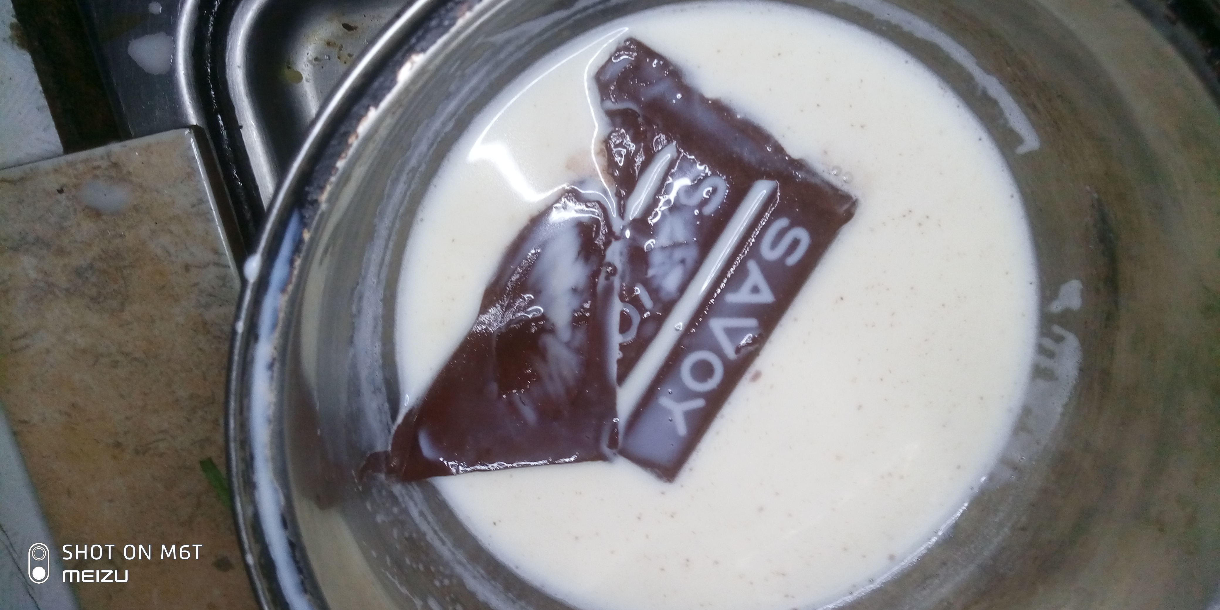 The first thing I do is to make a cup of milk, I mix water and milk and put it in a pot with half a piece of the chocolate cup and put it on low heat and stir with a spoon, until all the chocolate melts. Luego voy agregando el chocolate restante. Dejo un pedazo pequeño para rallarlo al final como decoración.