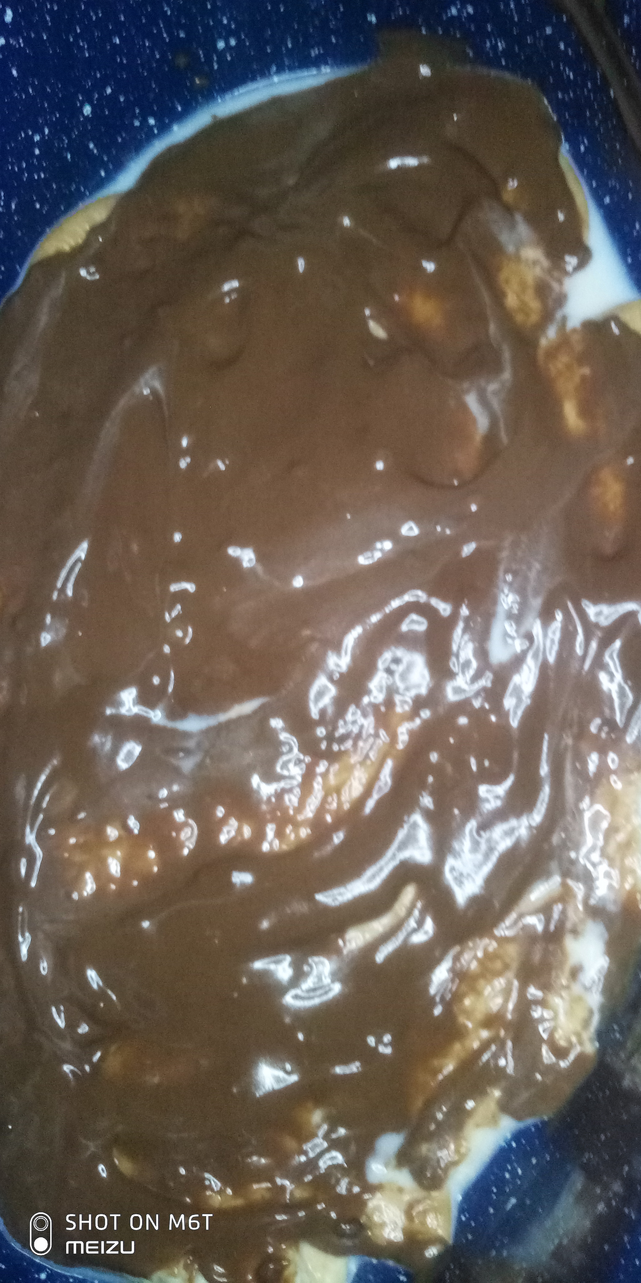 Luego de tener la primera capa de galletas, vamos a colocar una capa de chocolate bien extendido. Y así vamos haciendo sucesivamente hasta acabar las galletas y el chocolate de ultima capa.