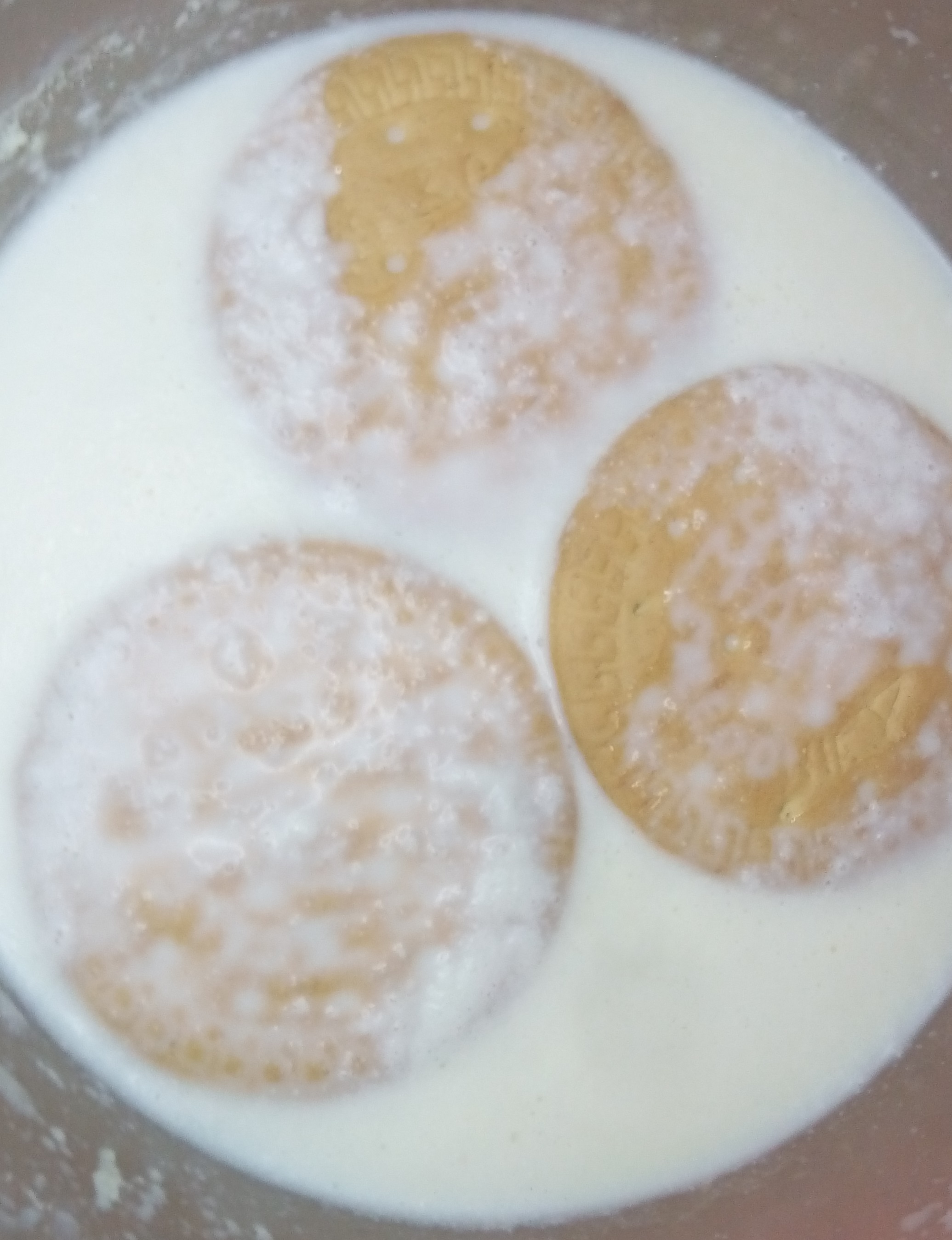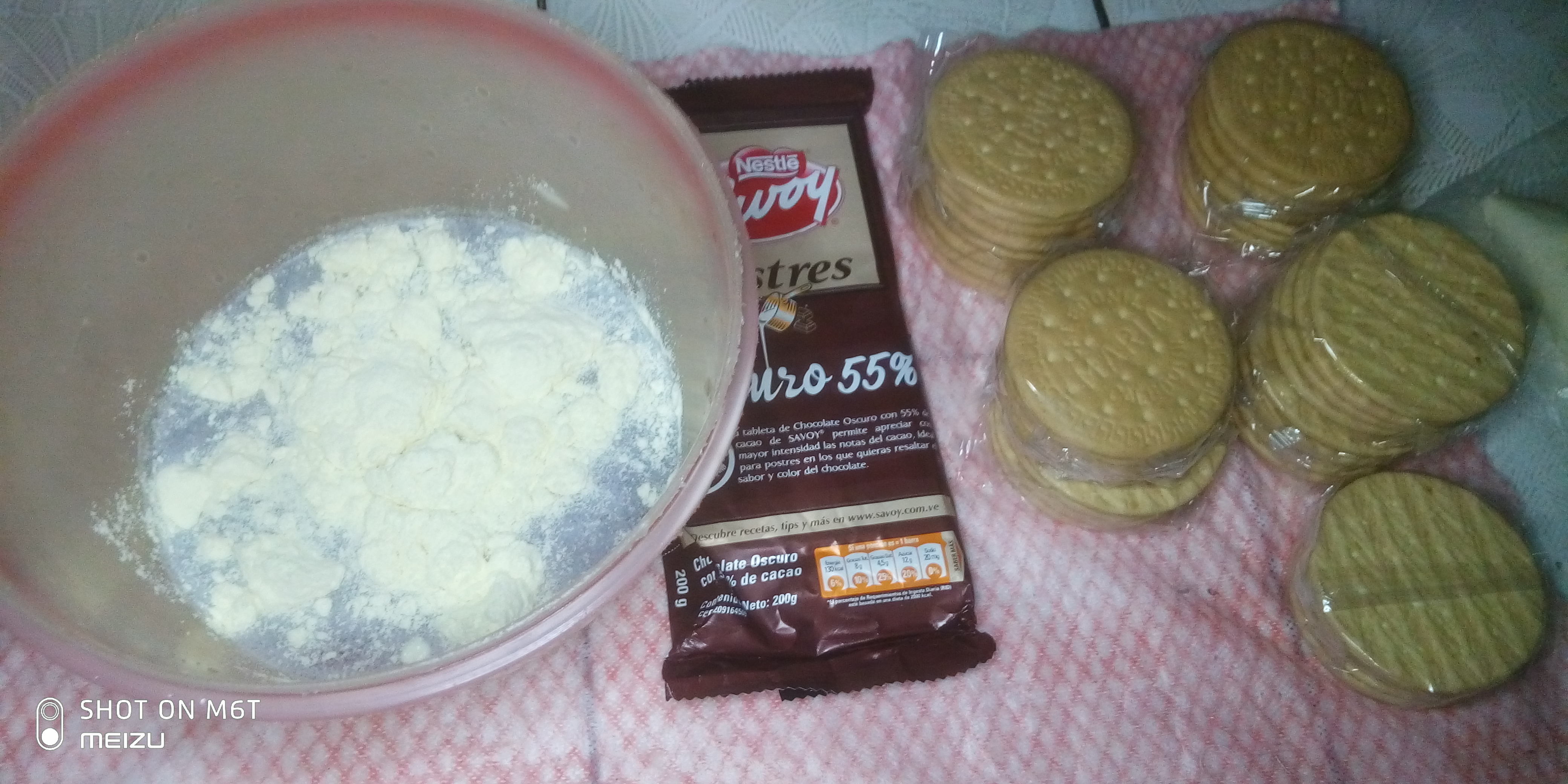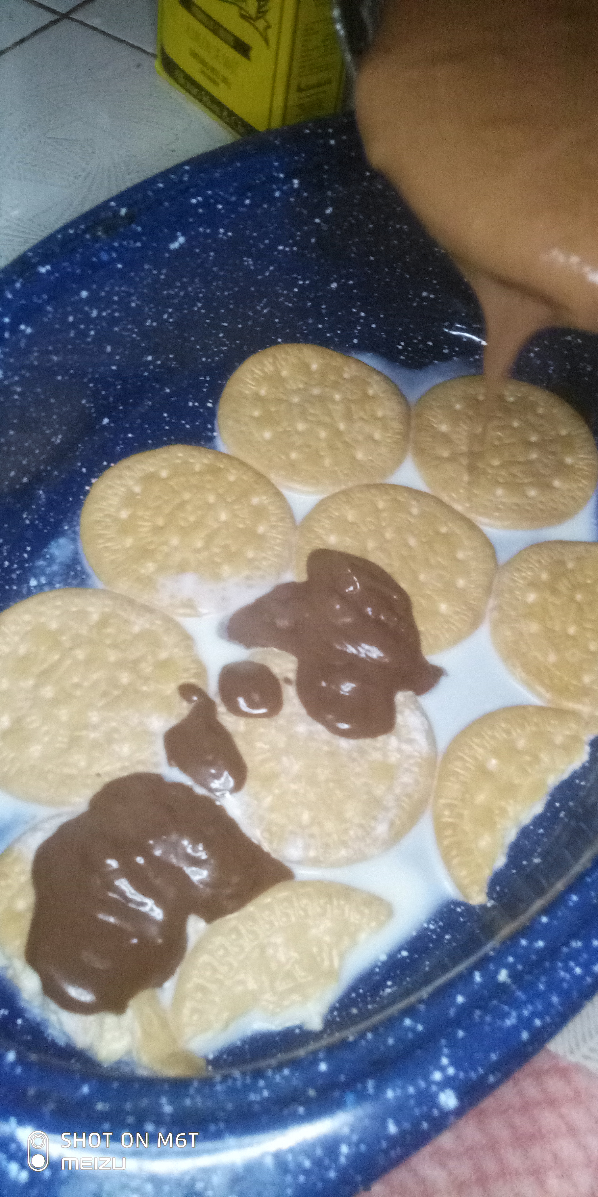 Y en una cazuela o molde mediano, empezamos a colocar una capa de galletas Maria remojadas en leche, primero debemos mojar las galletas en leche e inmediatamente pasar la galleta a al molde, porque sino se deshace.