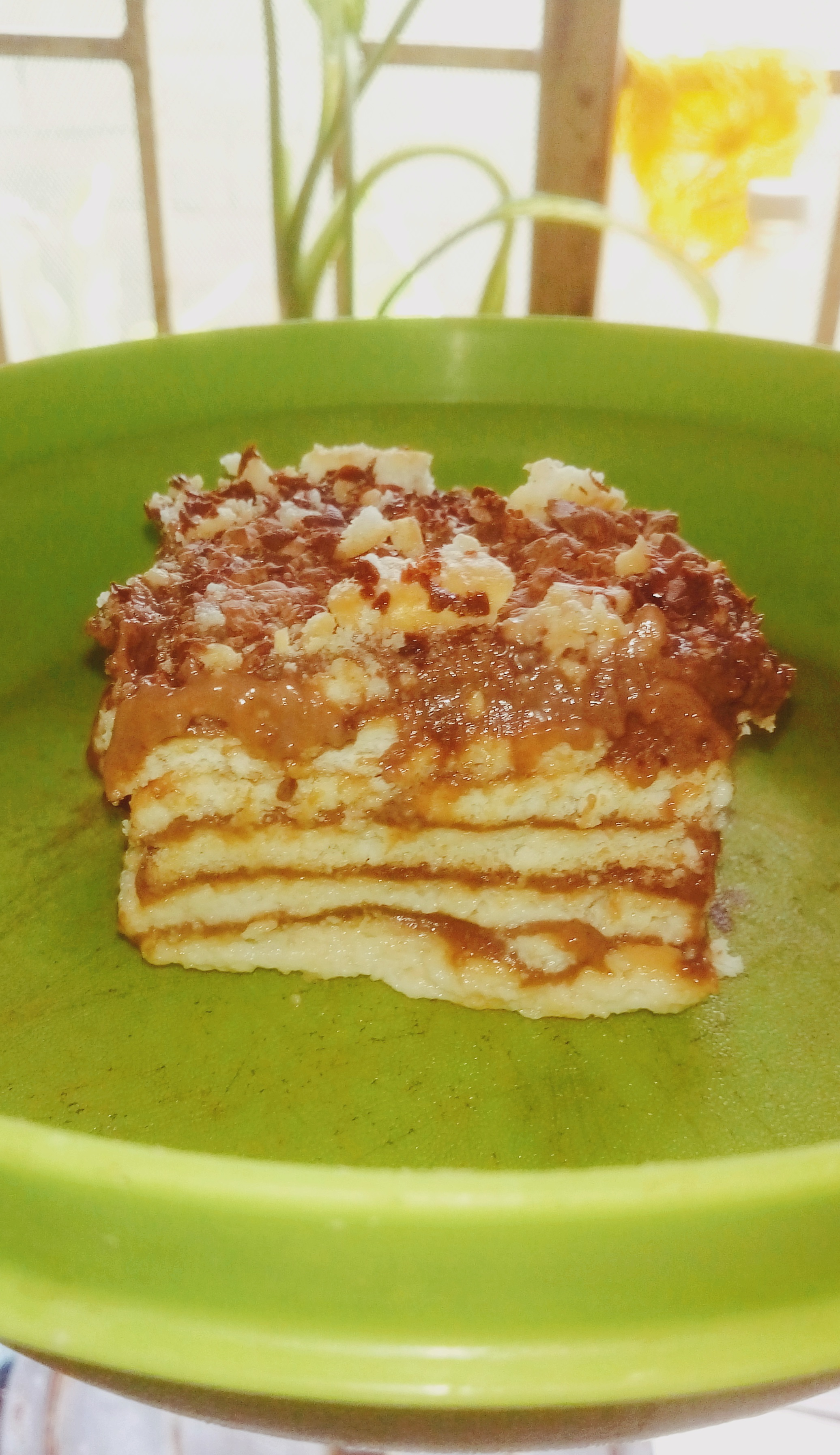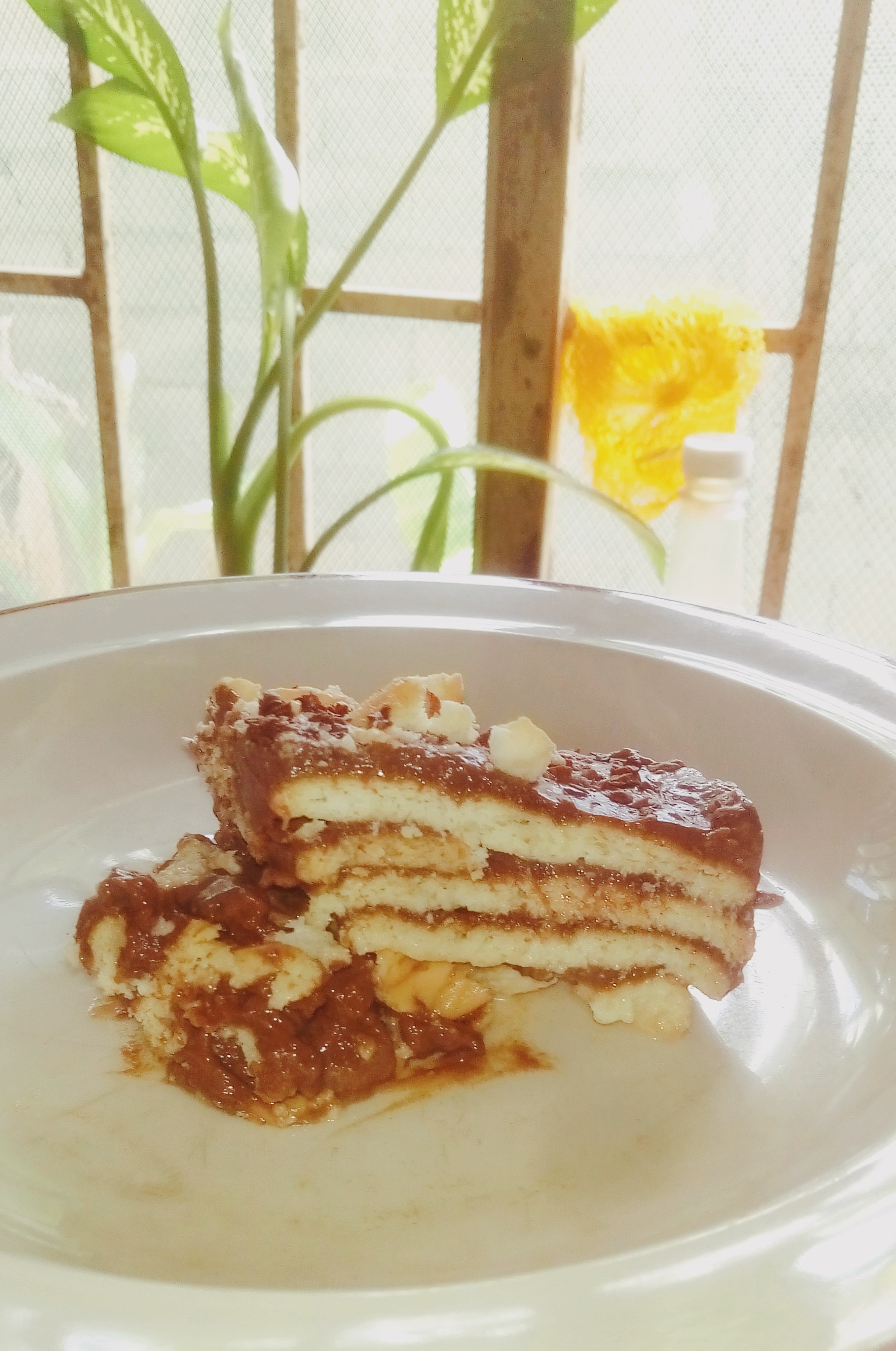 After having the first layer of cookies, we are going to place a layer of chocolate well spread. And so on until we finish the cookies and the last layer of chocolate.