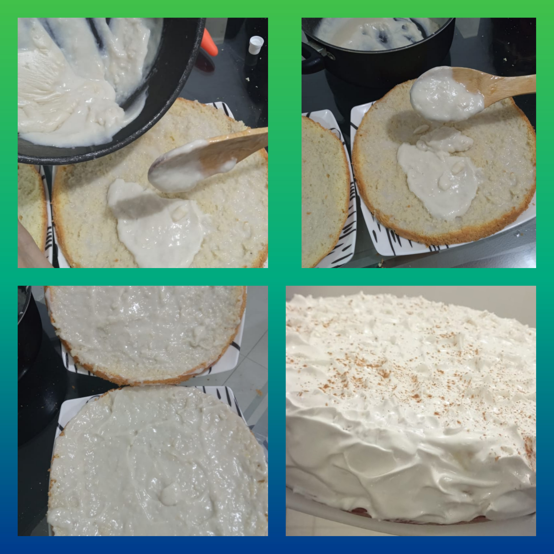 Después de humedecer el bizcocho preparamos mezcla para el relleno colocando en una olla a fuego lento la 1/2 taza de leche de coco, la maizena disuelta en agua, la lata de crema de coco, la leche condensada y el toque de vainilla y canela al gusto, dejamos cocinar hasta espesar, una vez lista dejamos reposar para rellenar nuestras capas y luego unirlas. Ya listo el bienmesabe procedi a preparar un merengue y adornar con canela en polvo.