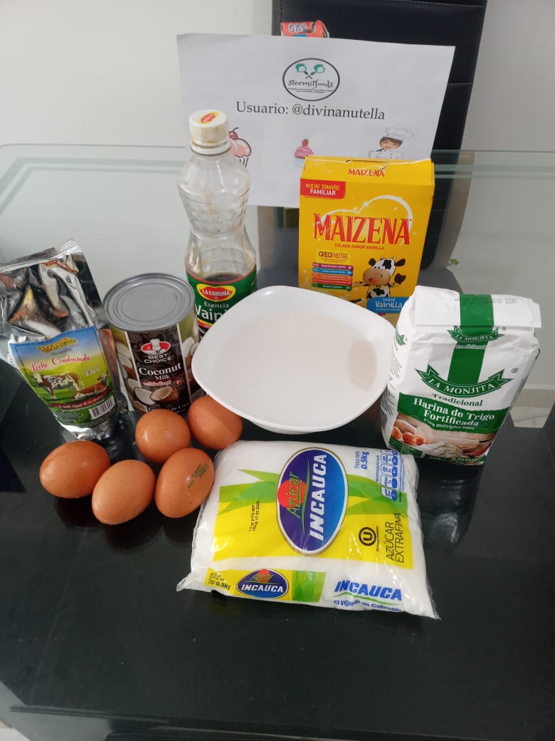 Lo primero que se hace es extraer la leche del coco previamente rallado, lo colocamos en la licuadora con 1 taza de agua caliente para que se haga más fácil sacar la leche, luego colocamos la mezcla en un pañito limpio exprimimos y así obtenemos la leche del coco. Luego de esto procedemos a elaborar el bizcocho colocando en un envase muy limpio y bien seco las claras de huevos las cuales batimos hasta formar picos, luego le agregamos la azúcar poco poco y seguimos batiendo por 5 minutos, después le agregamos la harina mezaclado con el polvo de hornear y mezclamos por poco tiempo con una paleta de forma envolvente hasta integrar, listo la mezcla lo vertemos en nuestra bandeja engrasada y enharinada y la llevamos al horno previamente precalentado por 35 minutos a 180°