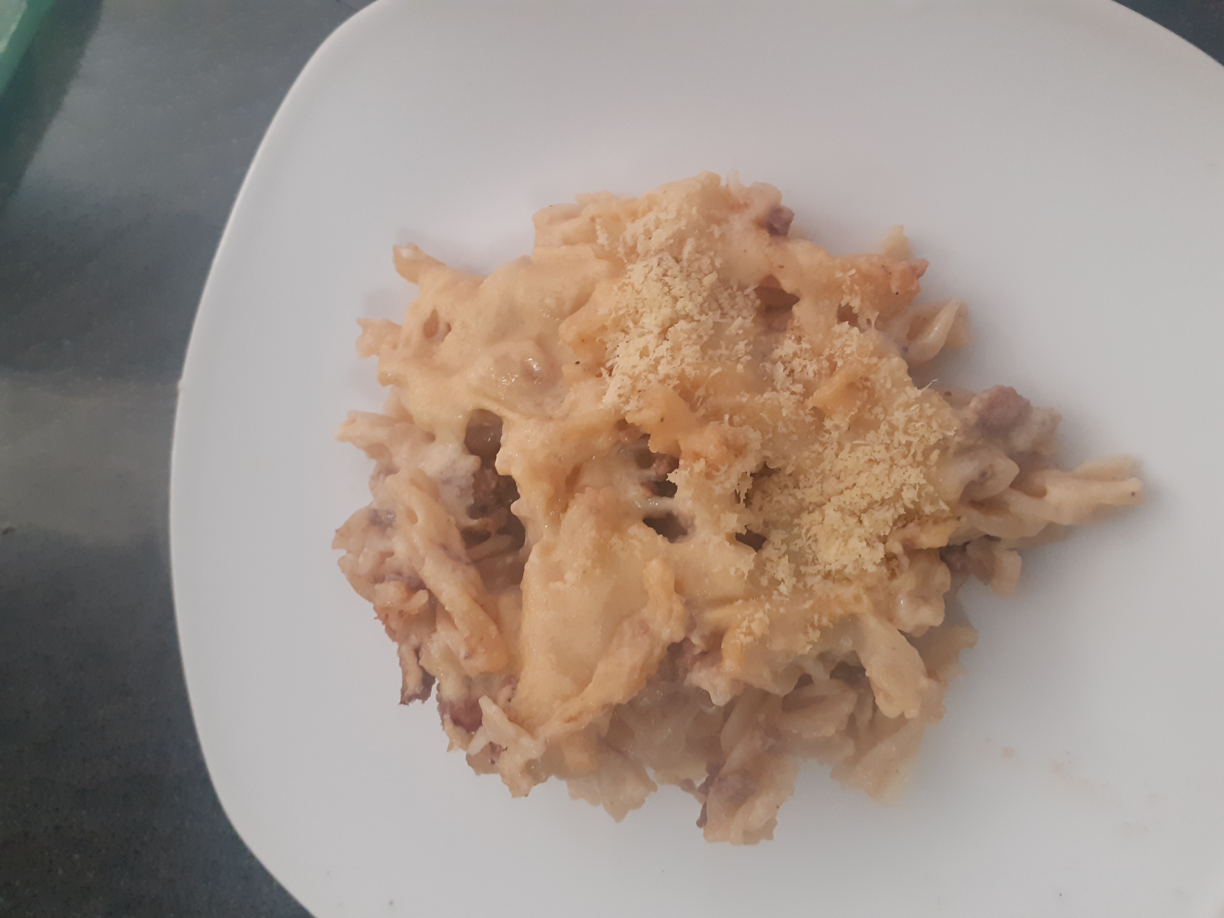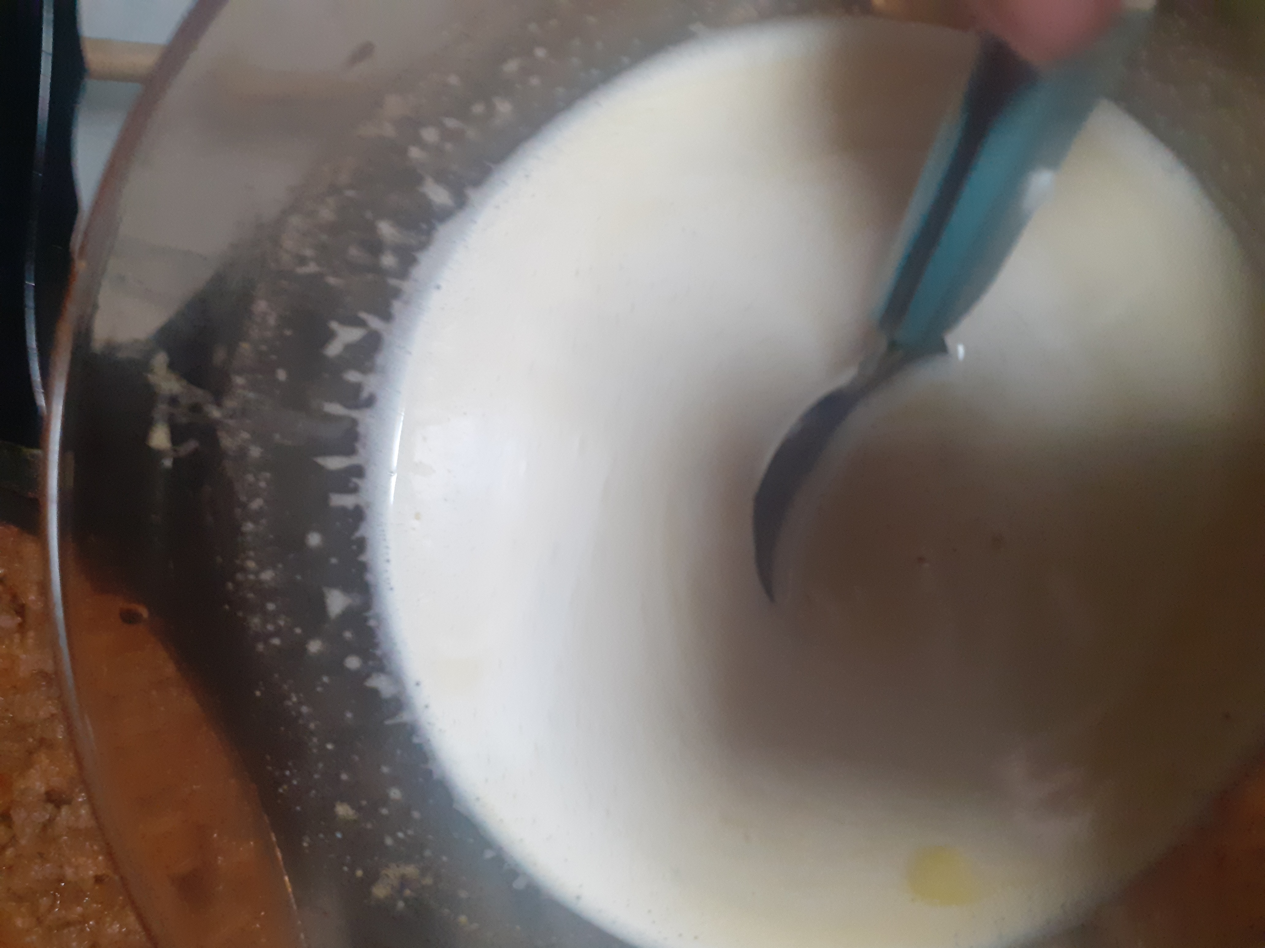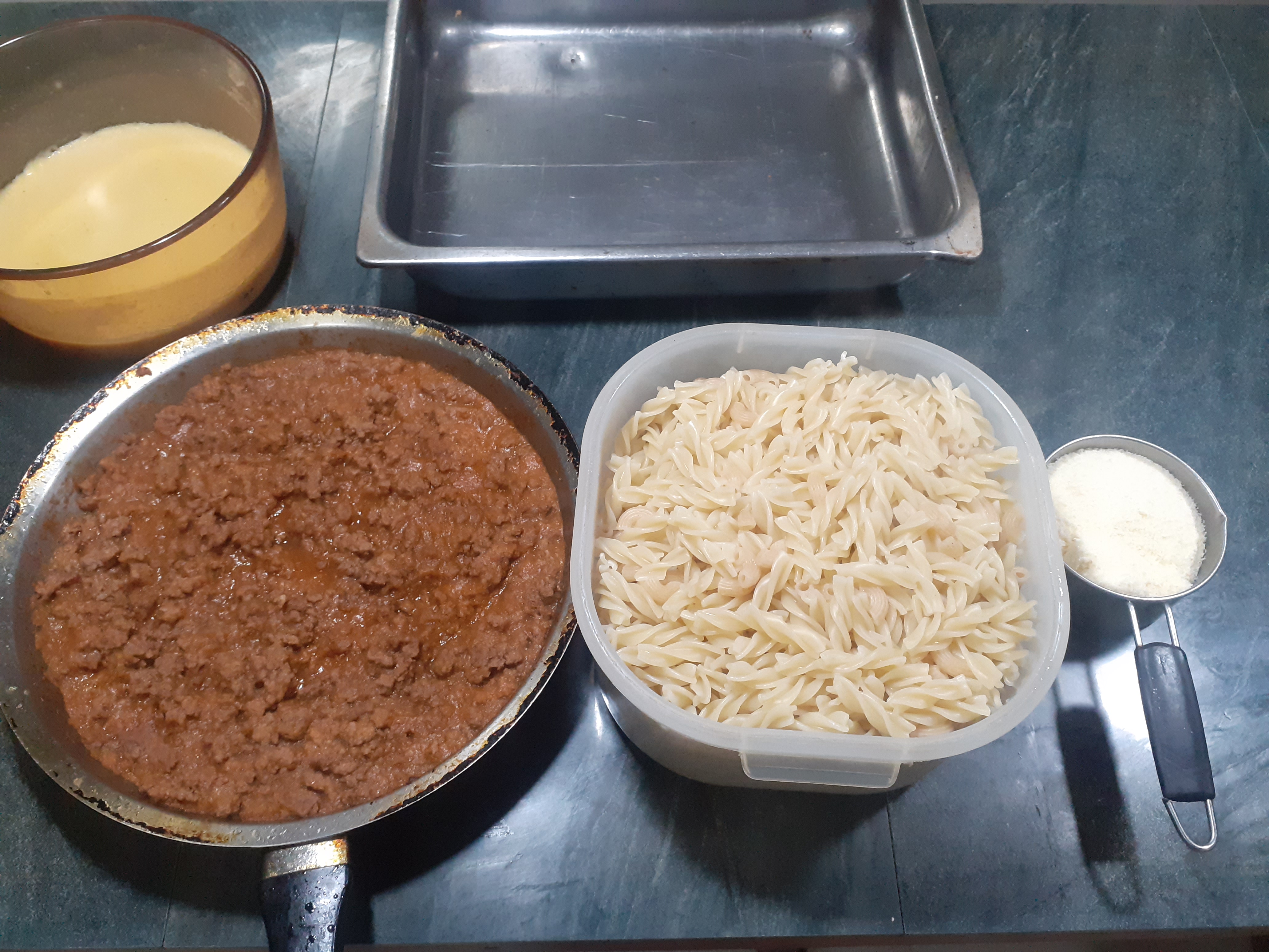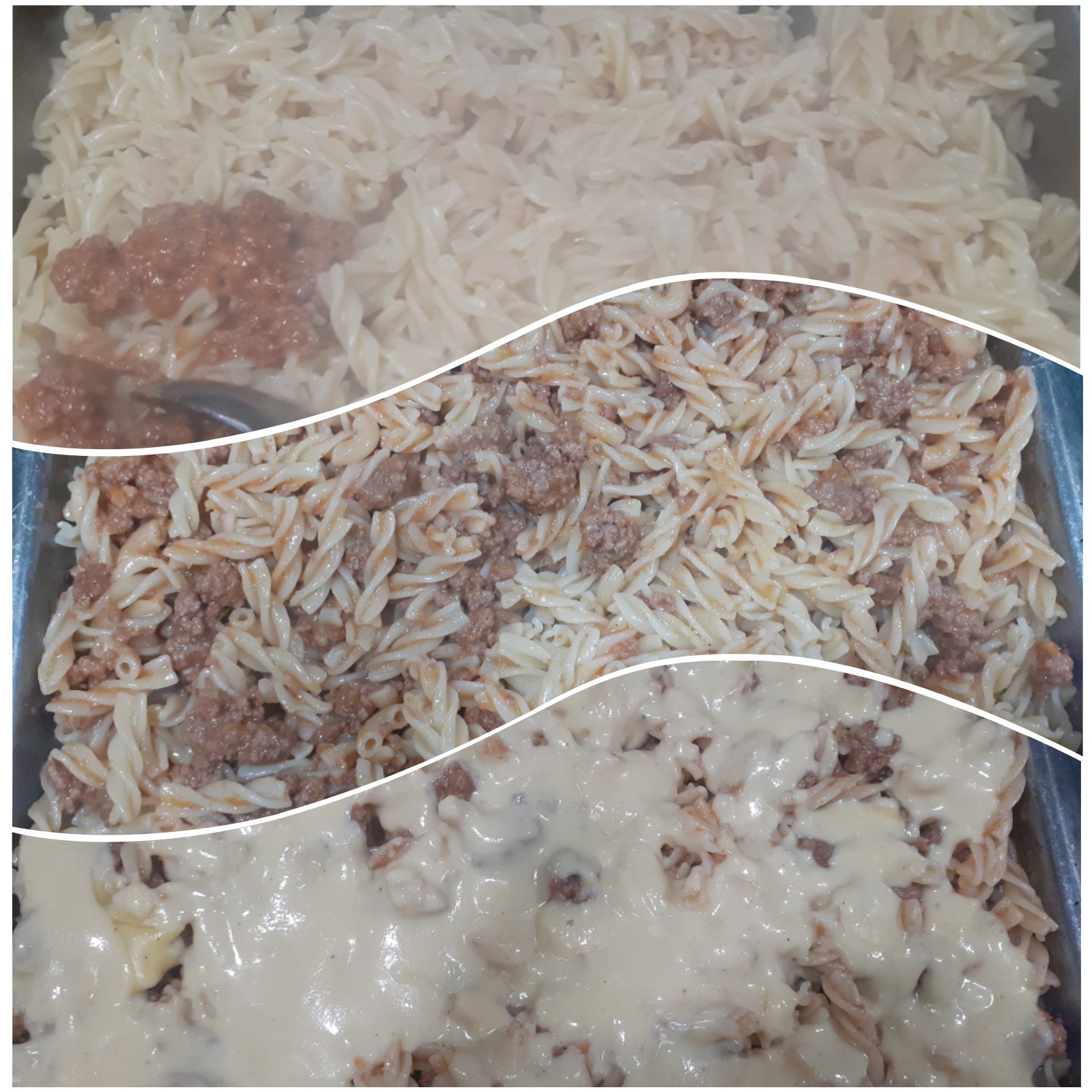 Paso 8: Una vez ya todo listo comenzaremos armar nuestro exquisito pastel. "La salsa de carne molida, la salsa blanca, la pasta y el queso pecorino"