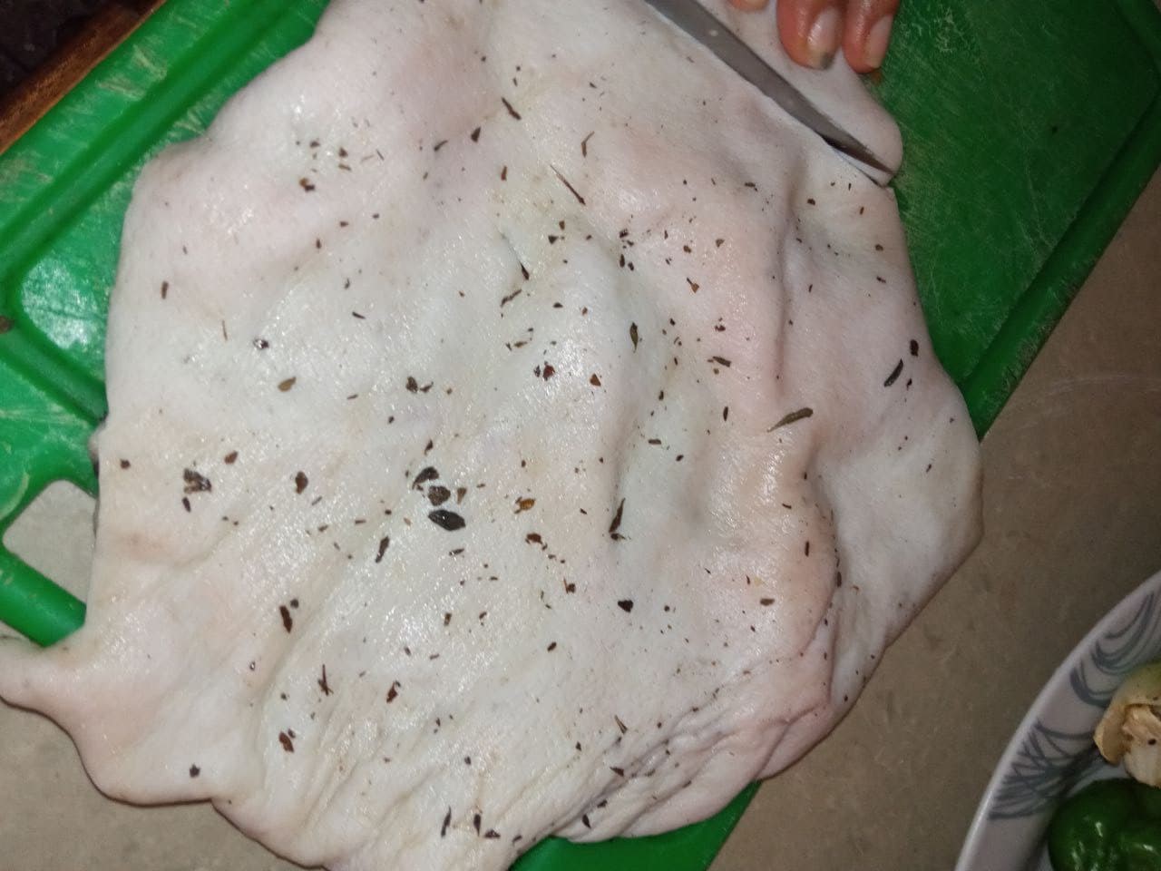 - Picamos el pellejo (o piel) de cochino en trozos pequeños o del tamaño de nuestra preferencia, luego lo llevamos a una olla con un poco de agua para que se ablanden y agregarnos un poco de orégano.