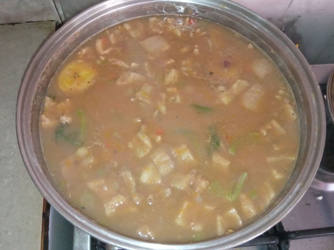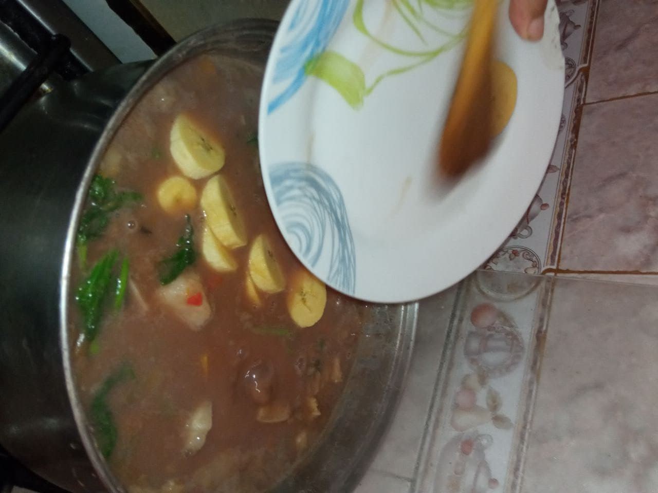 - Cuando las verduras se estén ablandando procedemos a agregar los plátanos que picamos anteriormente, también es el momento ideal para agregar los pellejos.