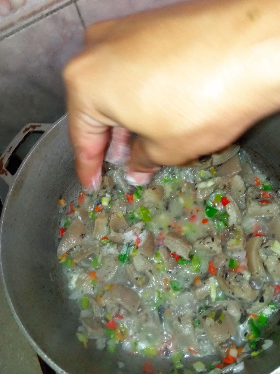 - Cuando el agua que le colocamos a los pellejos se este evaporando agregamos los aliños que picamos anteriormente, también condimentamos con sal, adobo o salsas de nuestra preferencia. Después esperamos a que seque totalmente.