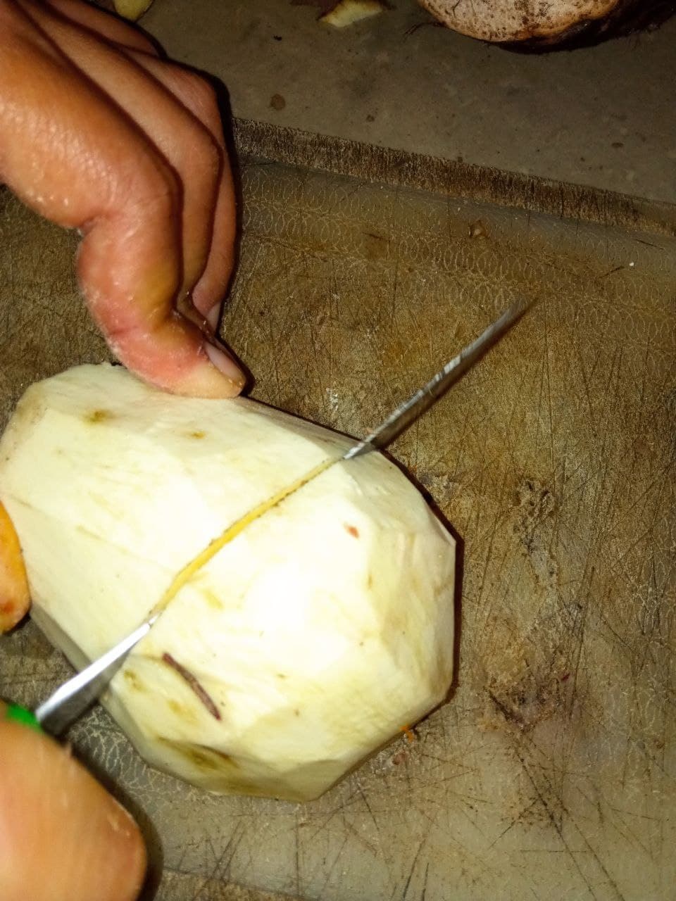 - Mientras estas se estan sancochando podemos pelar y picar las verduras de nuestra sopa, empezando por cualquiera de ellas, lo importante es pelar tanto el ocumo, la batata y los plátanos, la auyama pueden dejarla con la concha, depende del gusto.