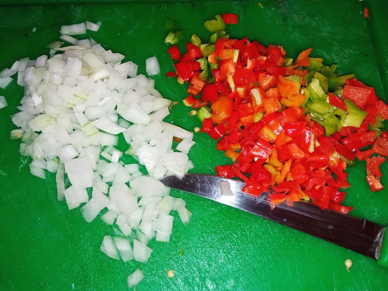 - También picamos los aliños que le van a dar una parte del gusto a la sopa, entre ellos la cebolla, los ajíes, el cebollín y el ajó. Lo picamos en cuadritos y esperamos el momento para agregarlos.