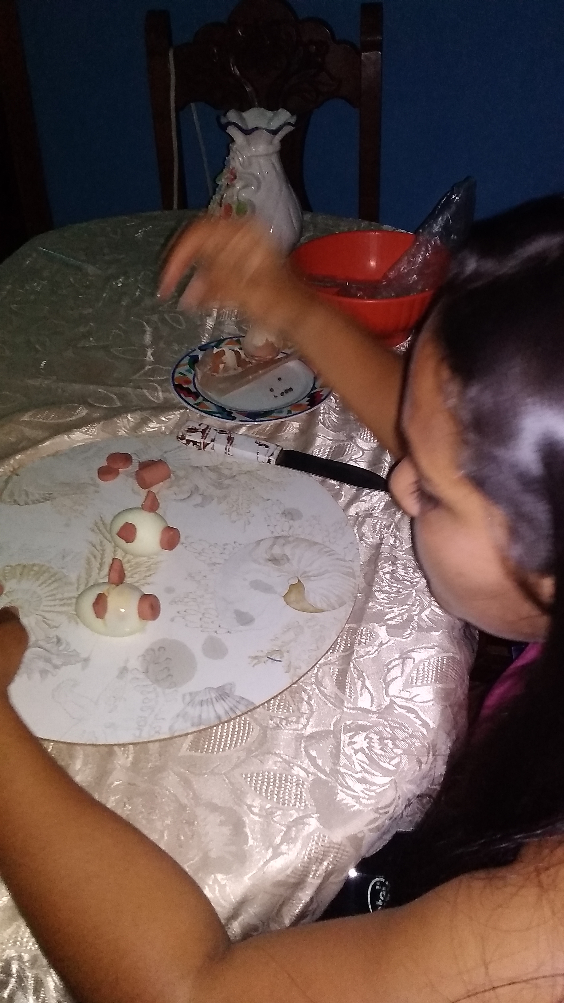 Paso 6: En este punto colocamos la trompa que serán los circulos que cortamos anteriormente y también colocaremos los granos de pimienta que son los ojos.