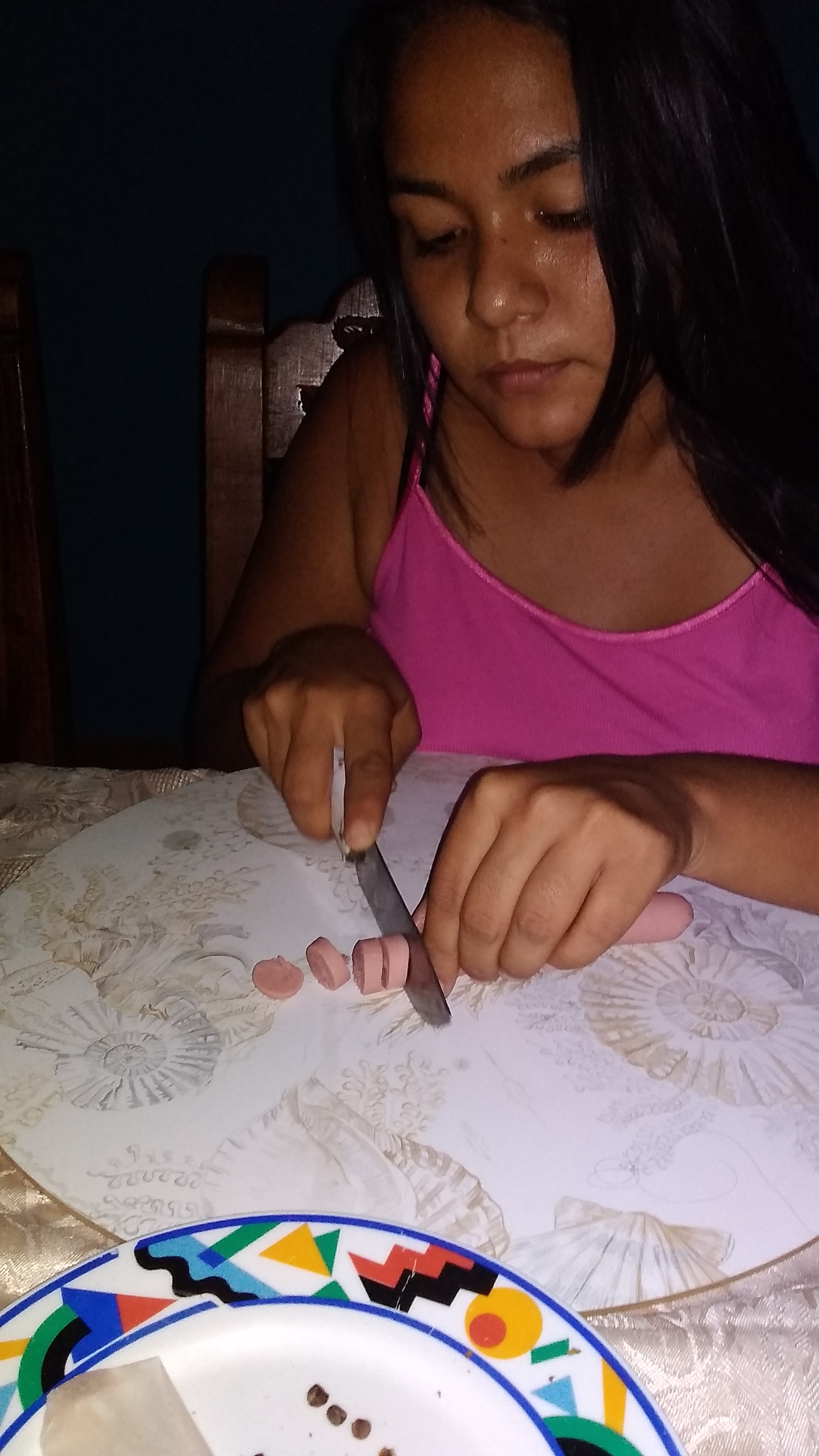 Paso 3: Cortamos la salchicha en circulos para las trompas de nuestros cerditos y triángulos para las orejas.