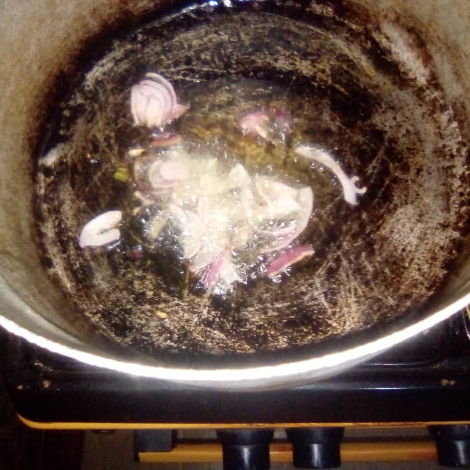 Next I put a clean pot on fire and poured in a cooking spoon full of vegetable oil. I heated it up and poured in a small bulb of finely chopped onion.