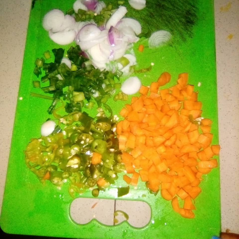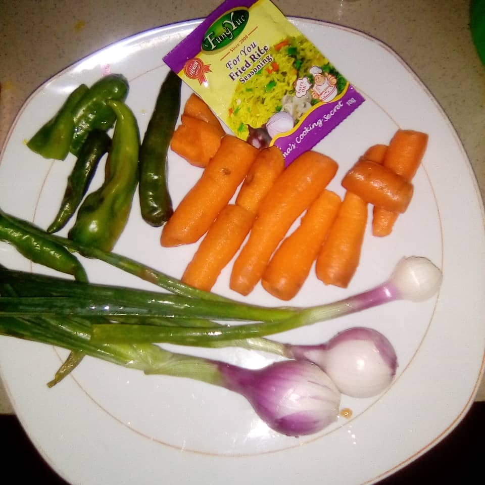 1cup baby carrots, 5 green chilli peppers, 3 Spring onions and a sachet/1tbs of fried rice spice