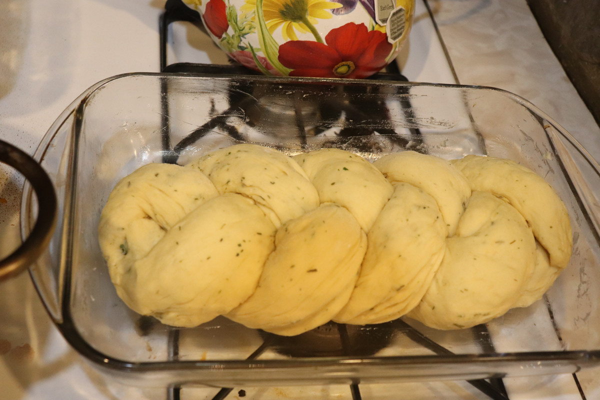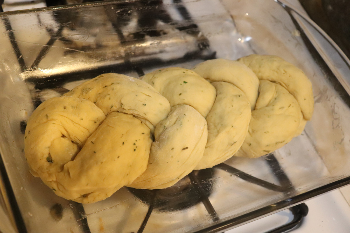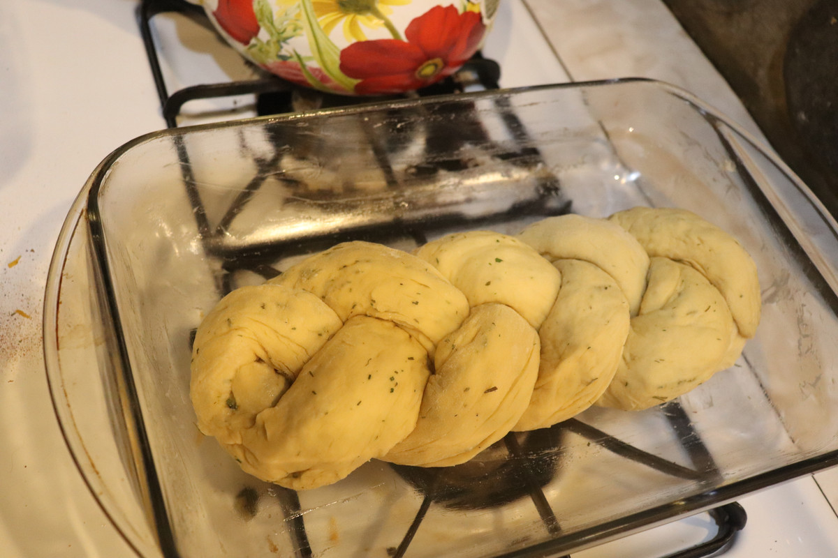 Then, I got to work. First, I added some sprinkles of garlic powder to my dough. Then, I also mixed in some dehydrated Egyptian walking onion green from our garden. Soon, the dough smelled fantastic, and it was time to try something new. I split the dough into three equal(ish) portions and rolled them into long "snakes." Then I tucked the ends together on one side and began to braid. Soon, it was ready to rise.