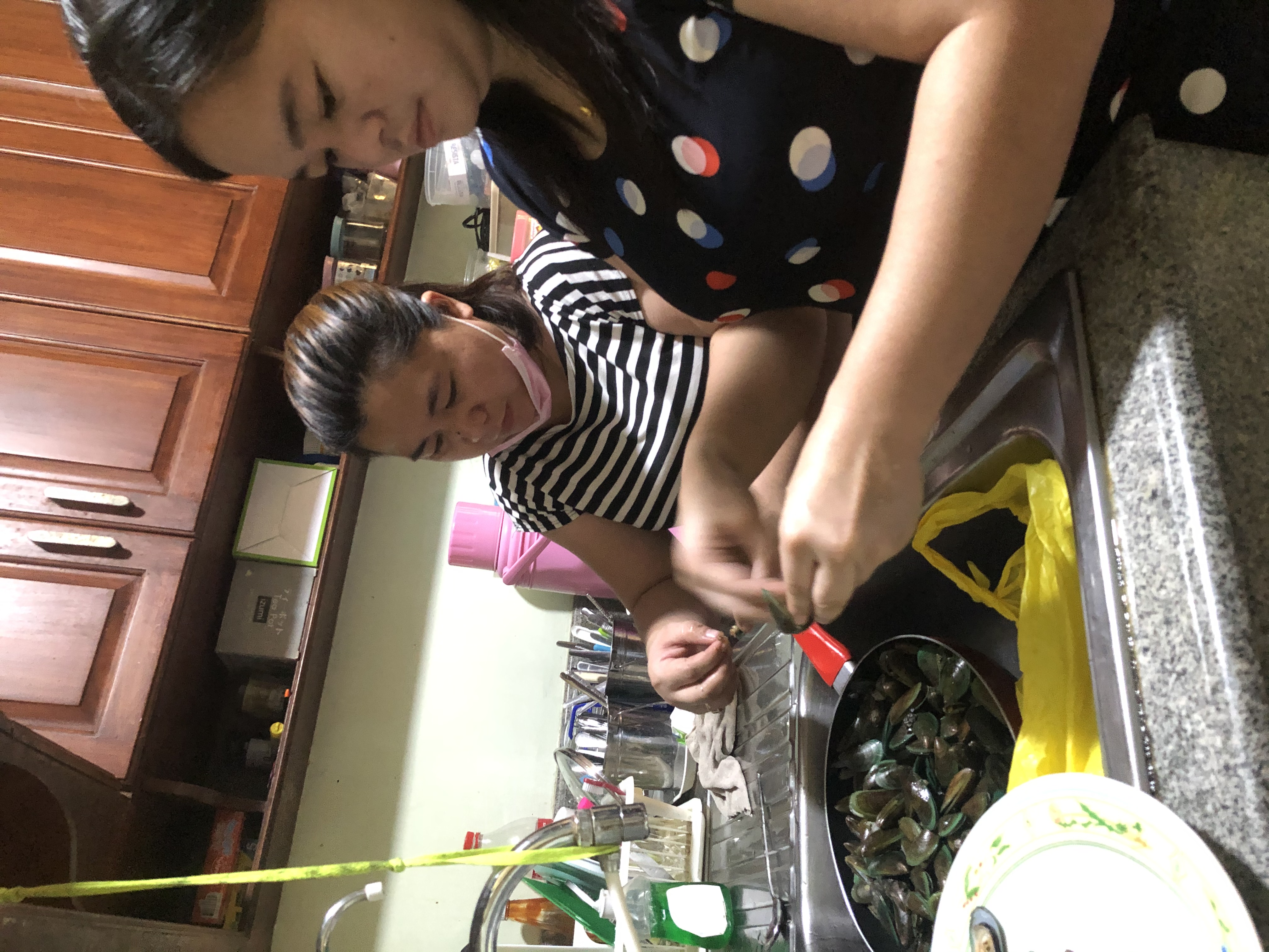 My younger sister Dez helped me clean the mussels. It is very important to clean it first in order to take away the smell, the dirty thing mix in this mussels. By cleaning it with running water, the mussels is now set for cooking.