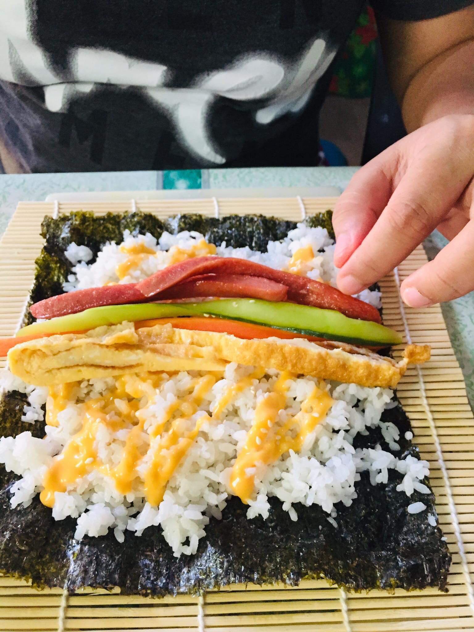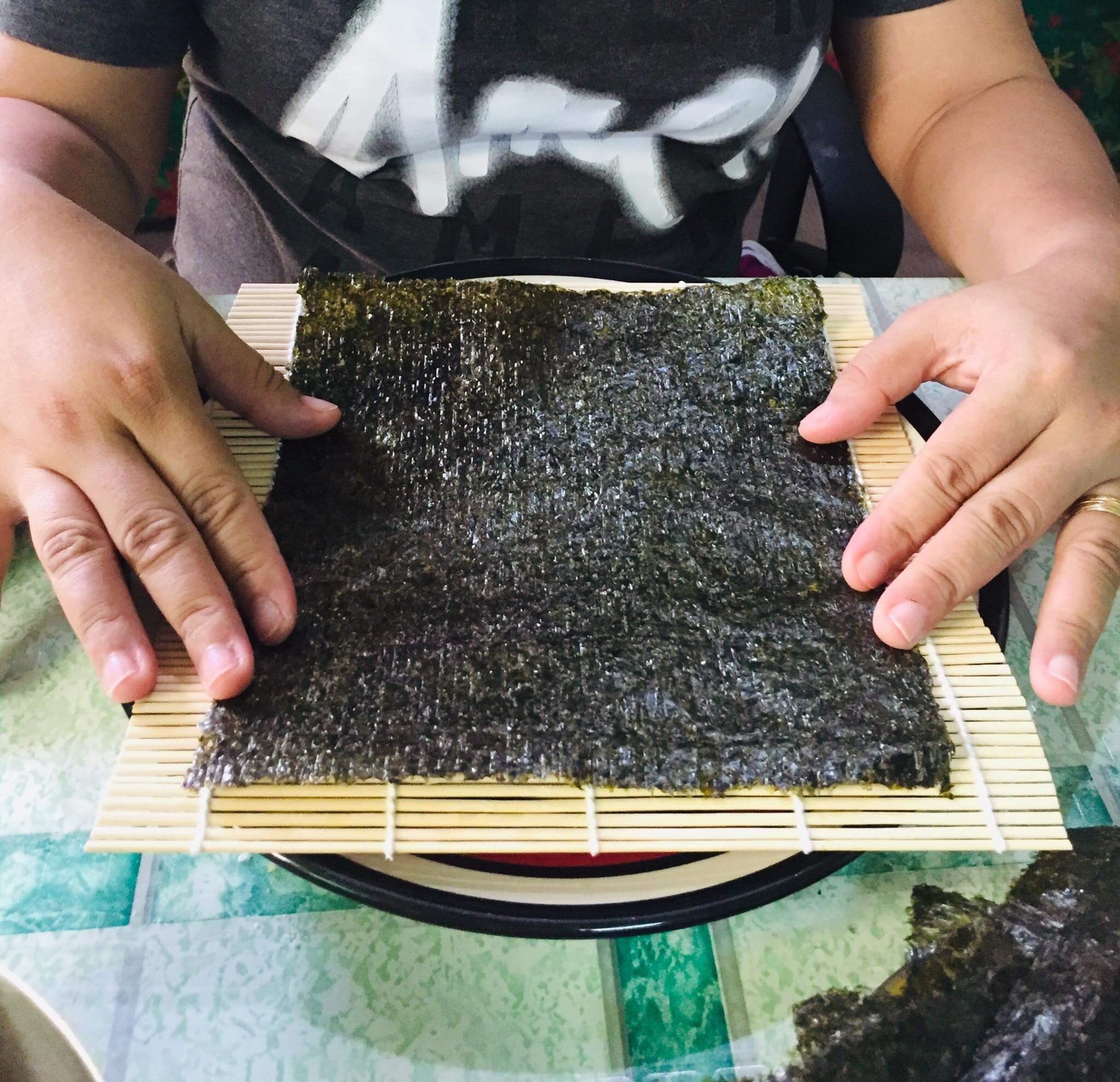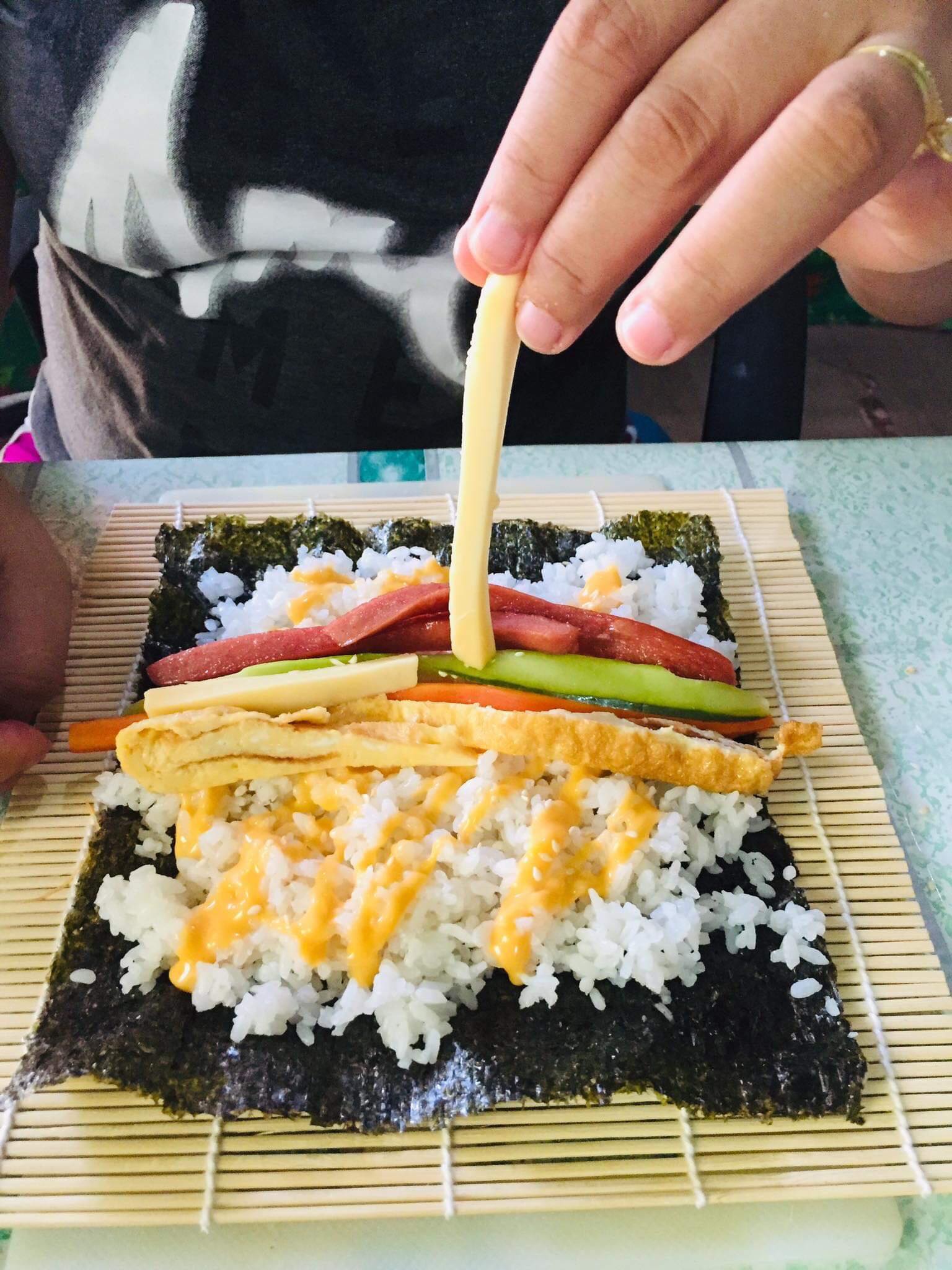 Now, with all your ingredients ready. You can now start assembling your Kimbap. You can use a bamboo roller mat or you can just freely roll it without using any tool. Make sure to apply just a slight force enough not to ruin but tightly seal your Kimbap.