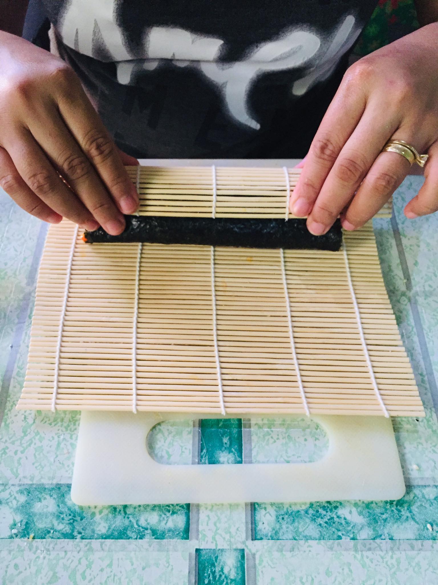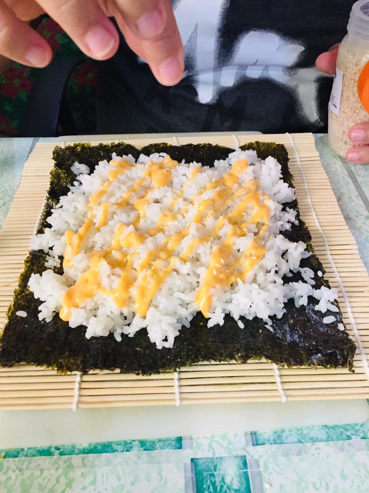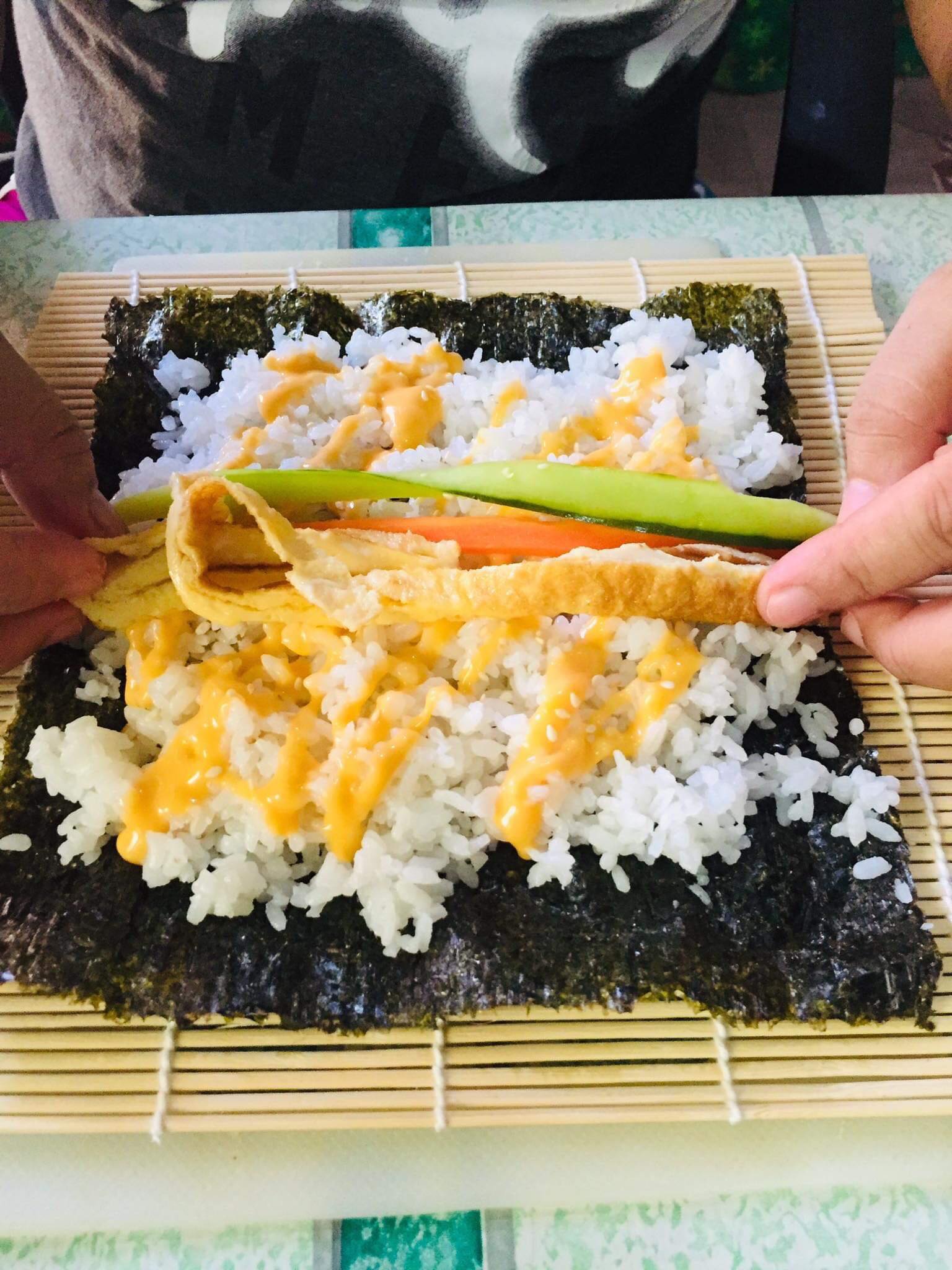 Now, with all your ingredients ready. You can now start assembling your Kimbap. You can use a bamboo roller mat or you can just freely roll it without using any tool. Make sure to apply just a slight force enough not to ruin but tightly seal your Kimbap.
