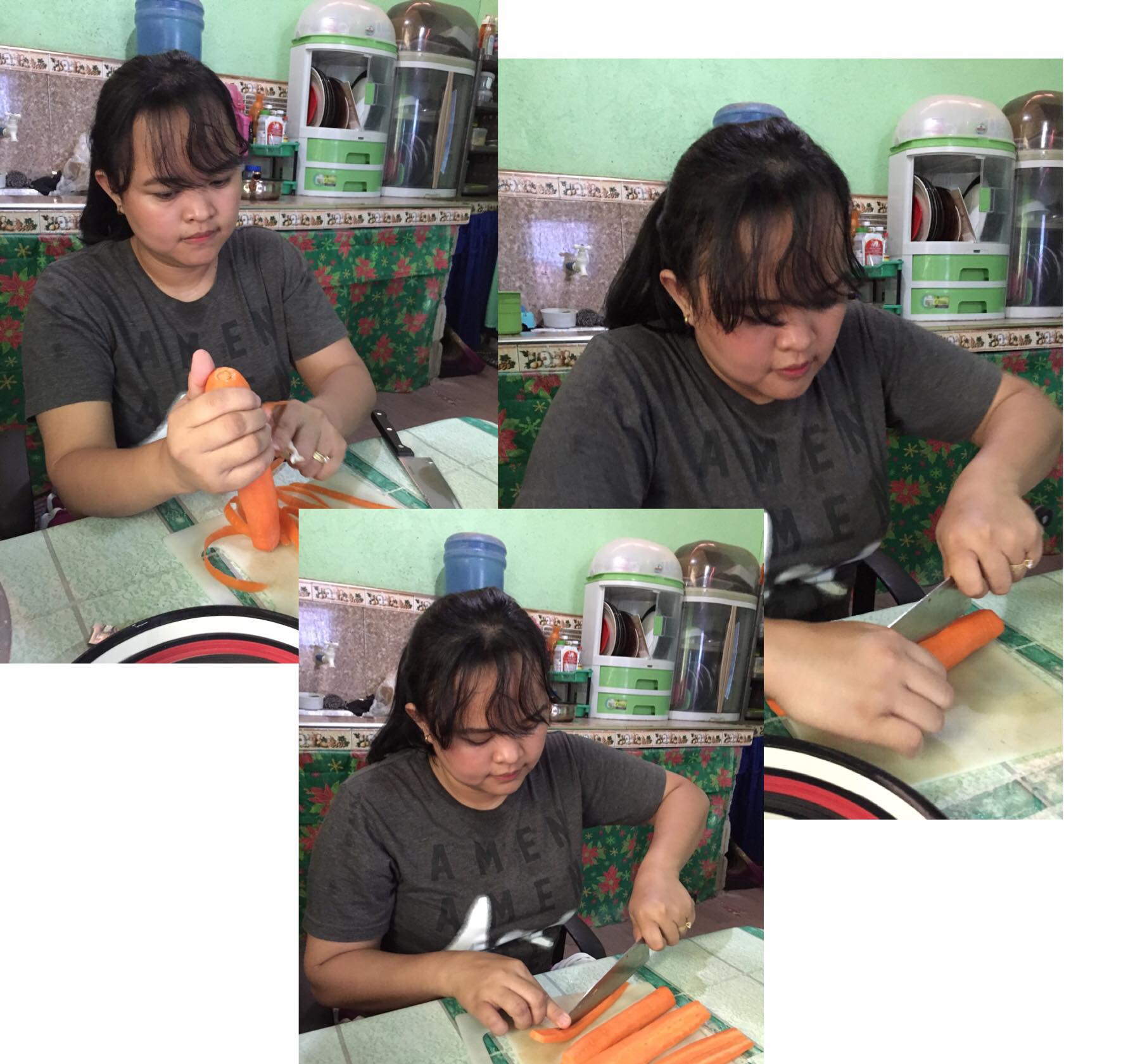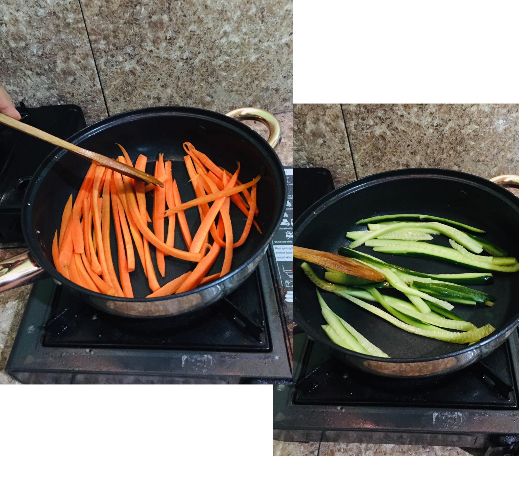 Remove carrot and cucumber from being soaked from vinegar and salt. In 10-15 seconds each, heat your cucumber and carrot in your dishpan.