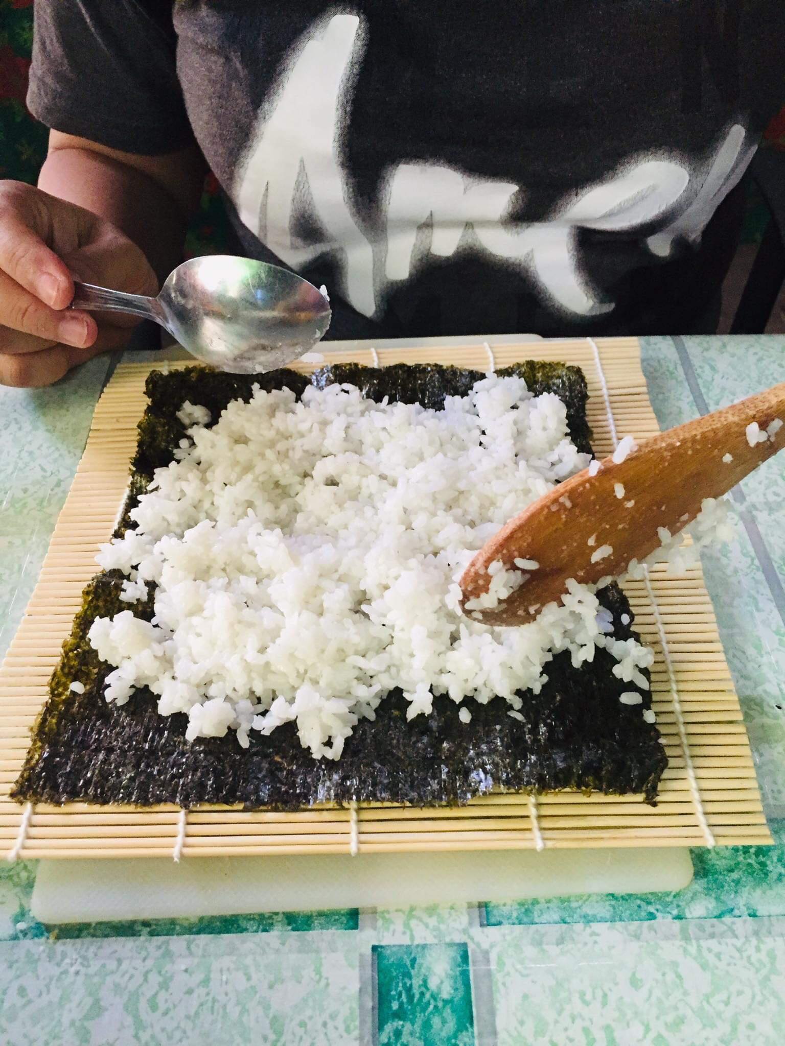 Evenly spread about 3/4 cup of rice on the wrap enough to cover it.