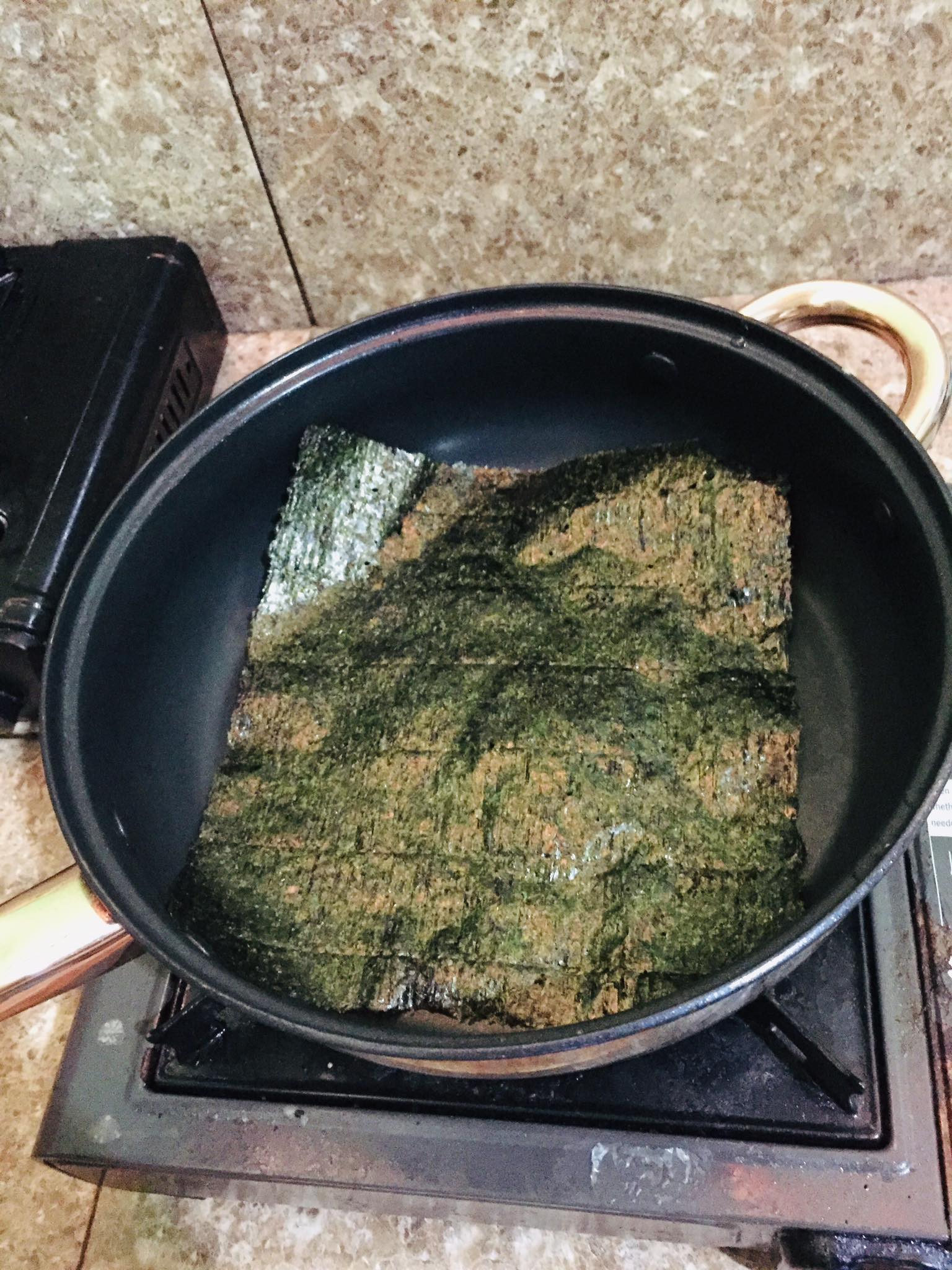 Same with your sliced carrot and cucumber, heat your seaweed wrap in your dishpan for 5-10 seconds.