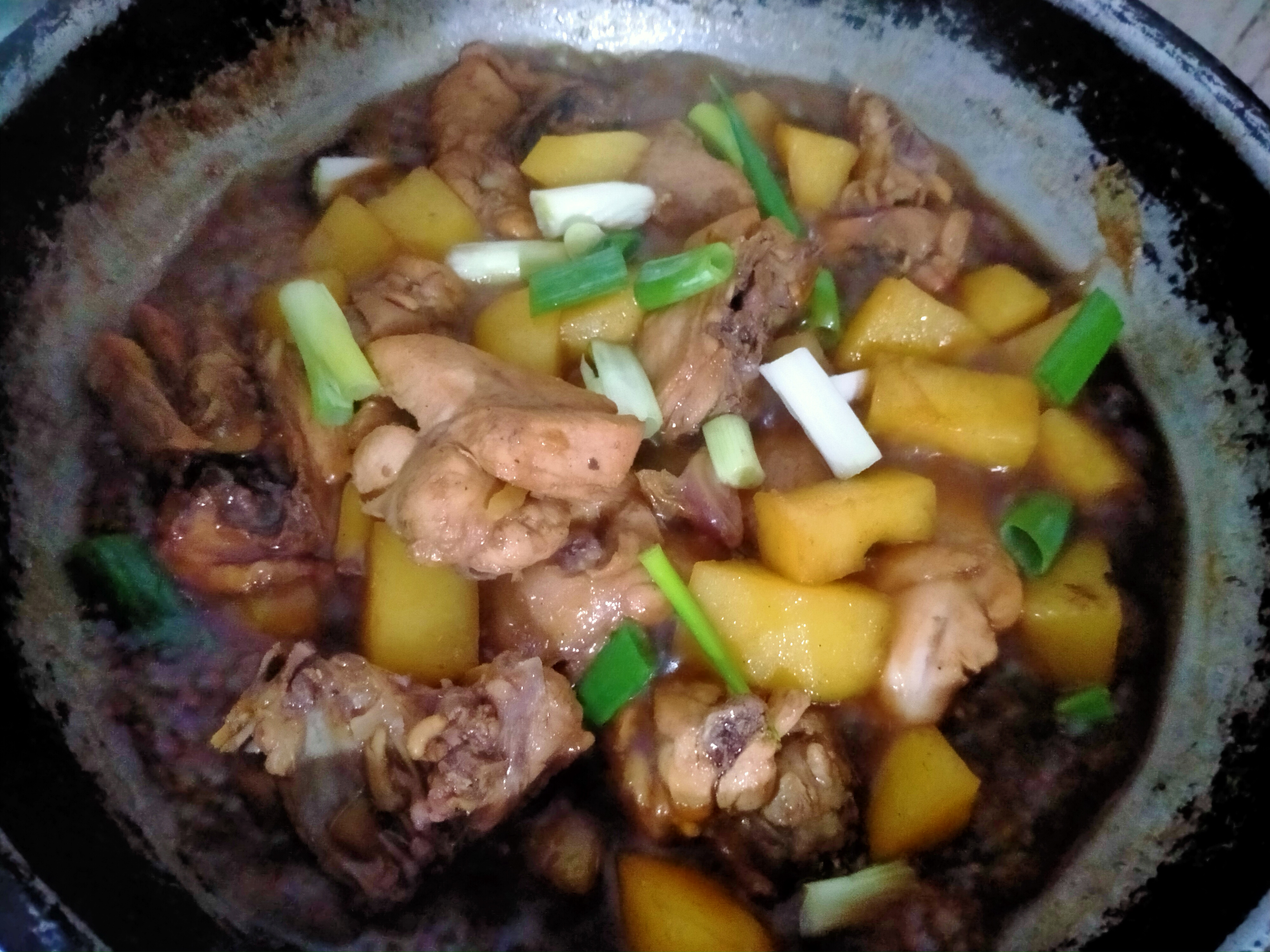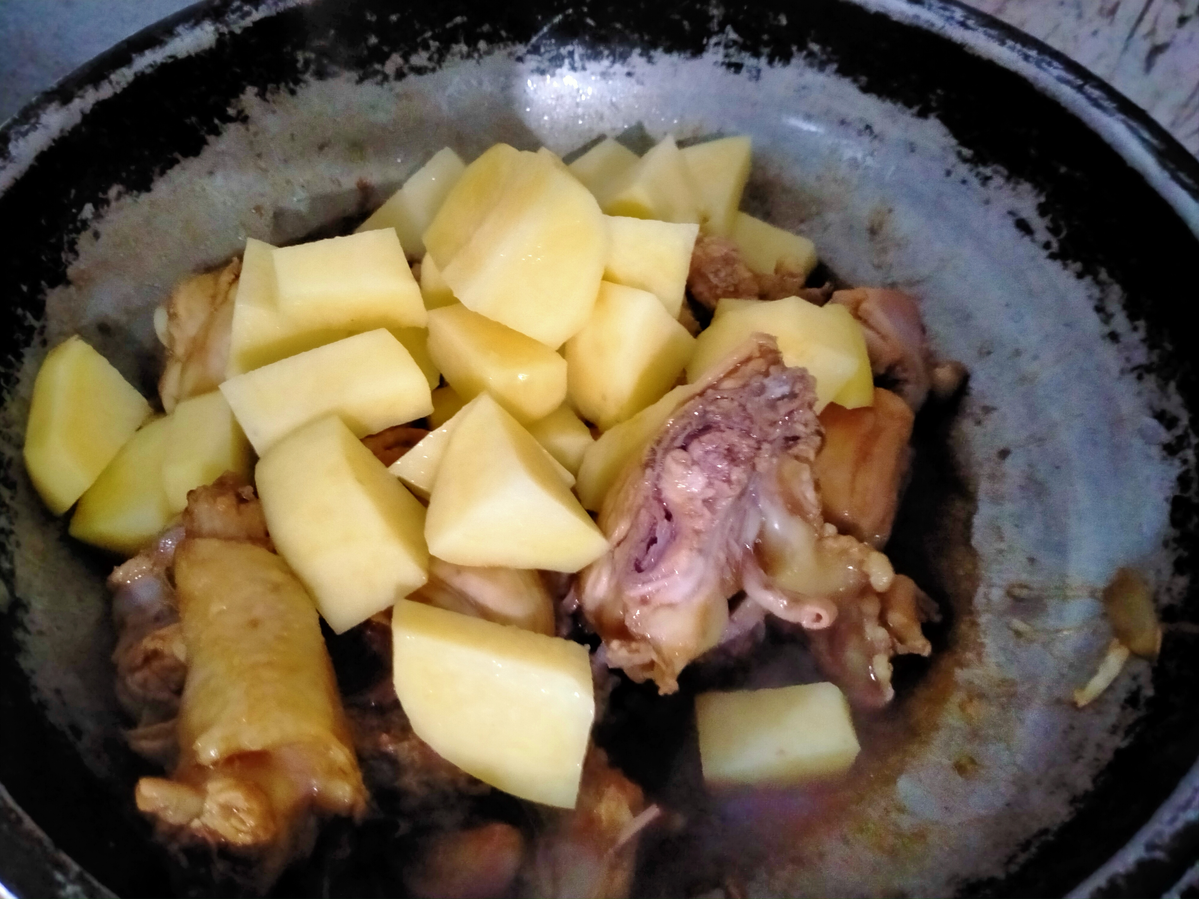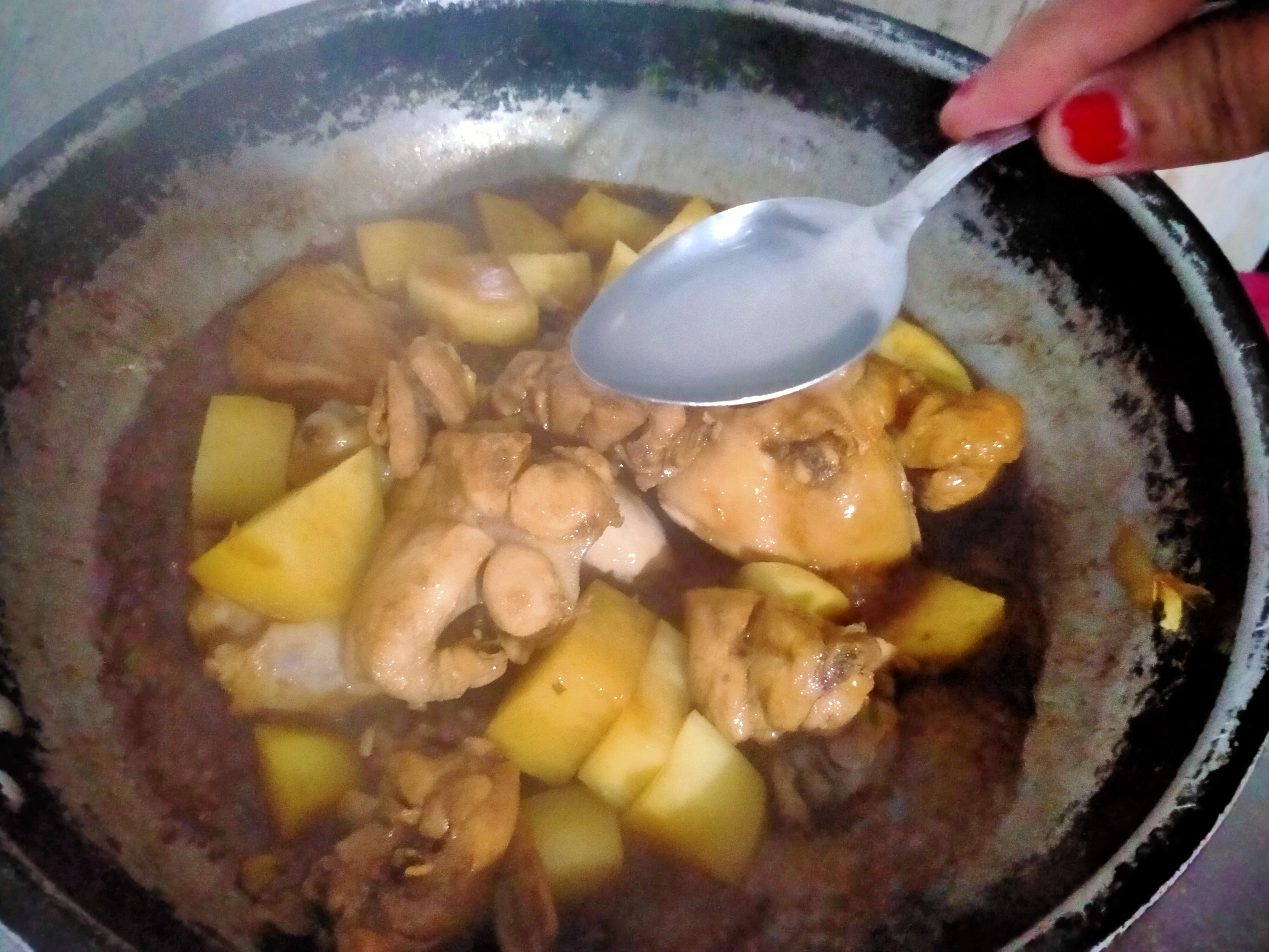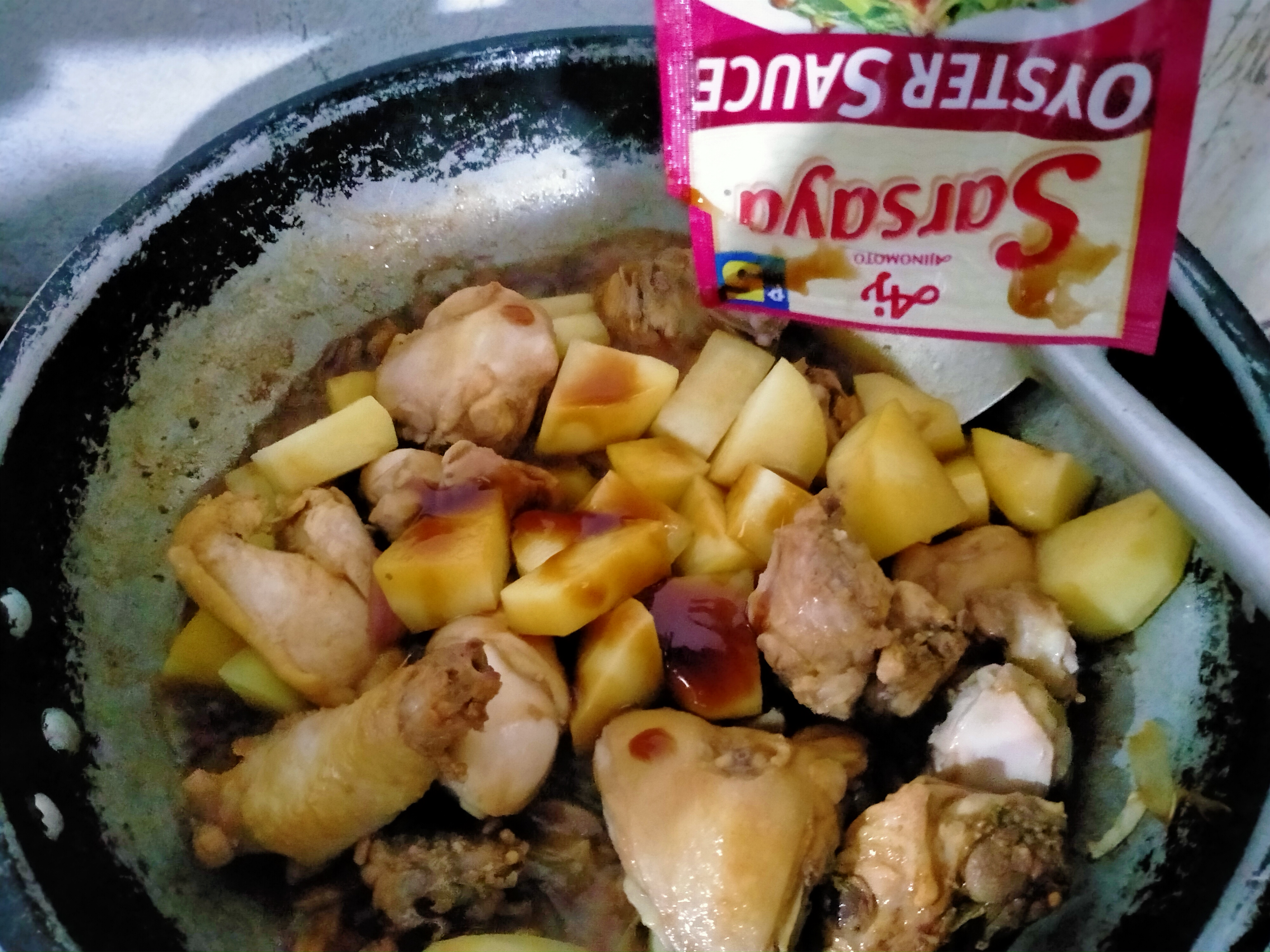 Potatoes are rich in minerals and vitamins that is good for our health, potato also is a antioxidant. - Now, after adding potatoes, let's put the oysters sauce. 1 sachet is enough. Mix it until the meat of the chicken will absorb the sauce.