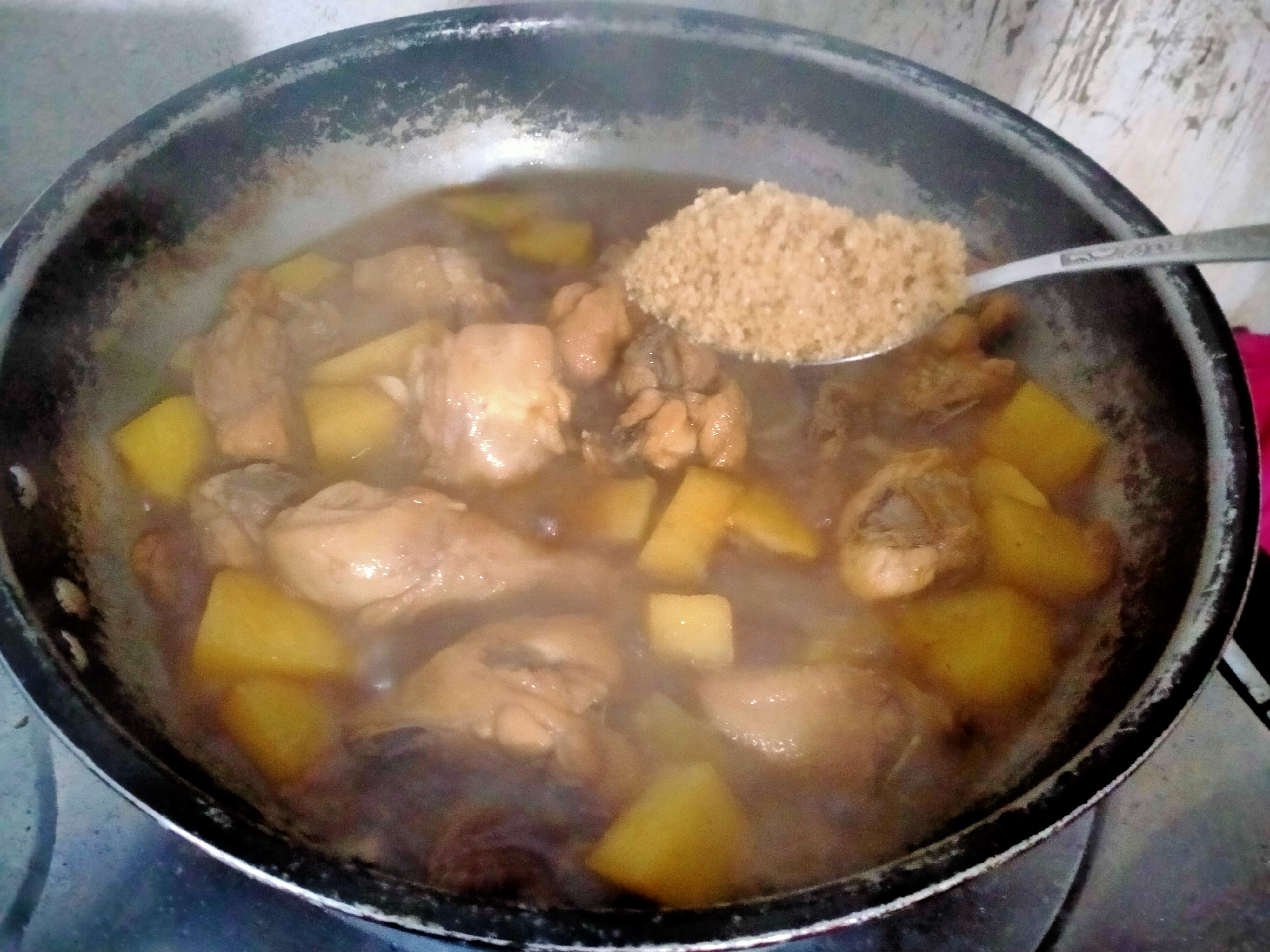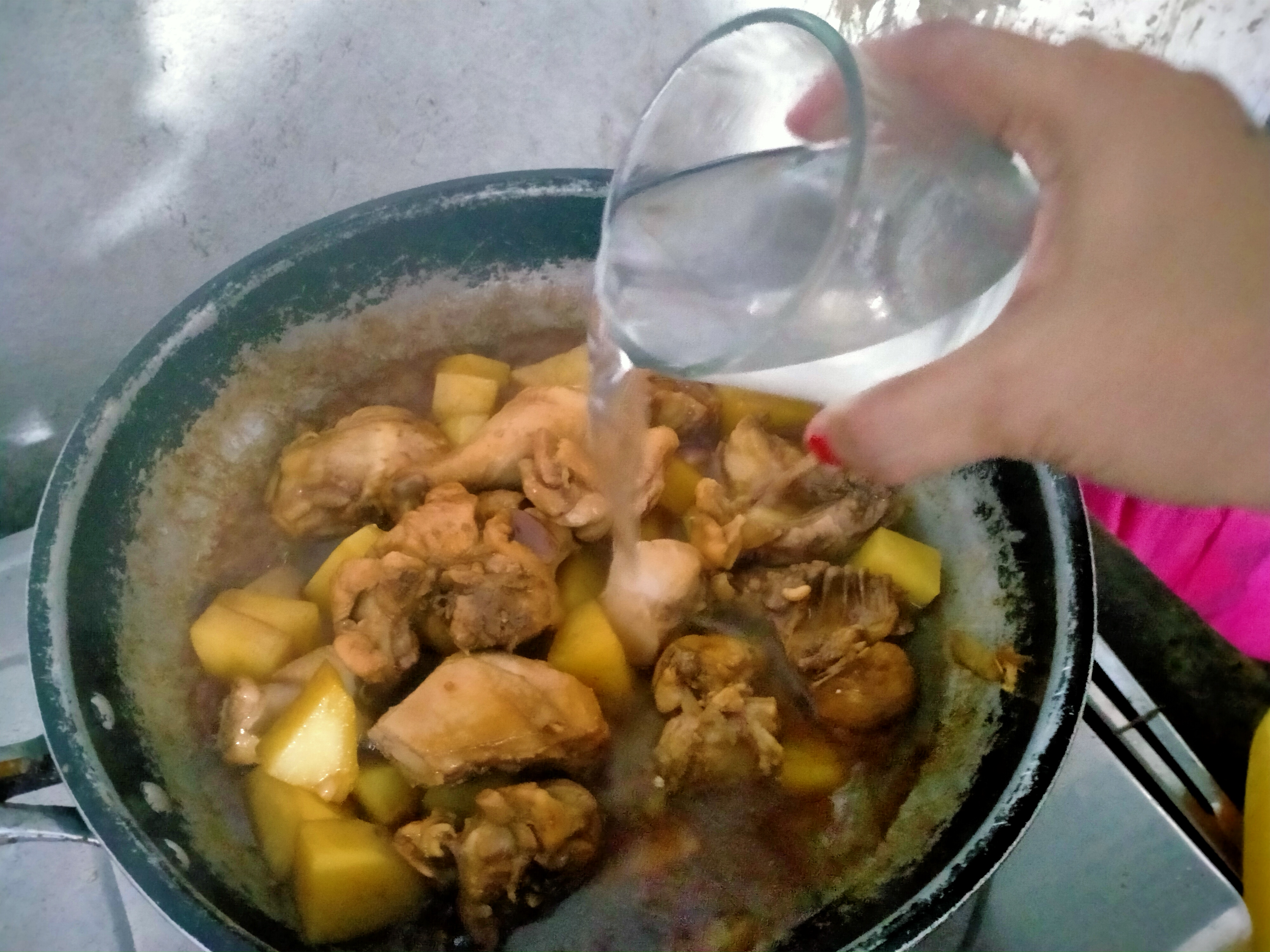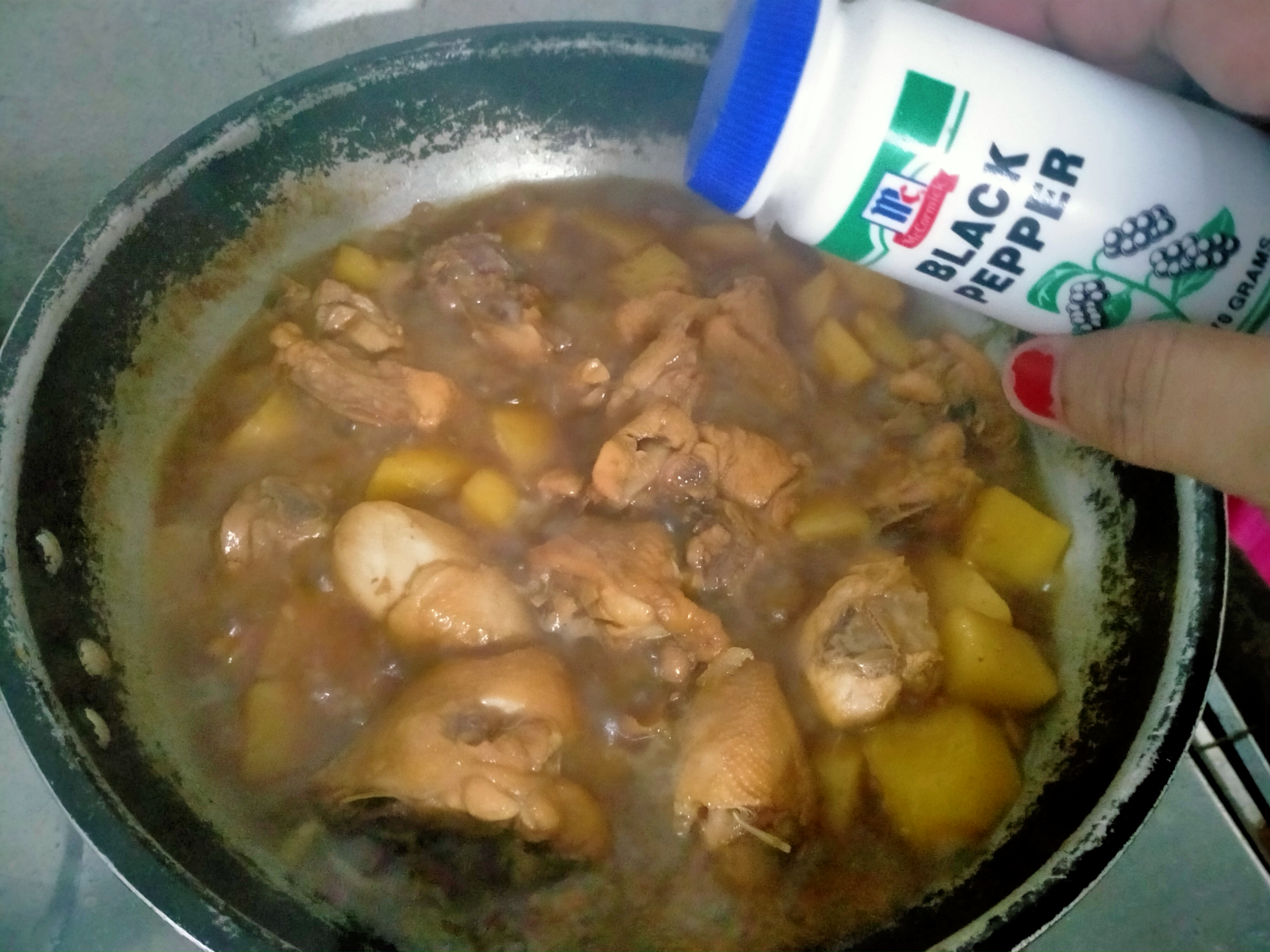 - Then, add 1 glass of water if needed, to help the meat soft and tender. Add also a pinch of black pepper to make it spicy and aromatic. And a 1 tablespoon of sugar and the sliced spring onion.