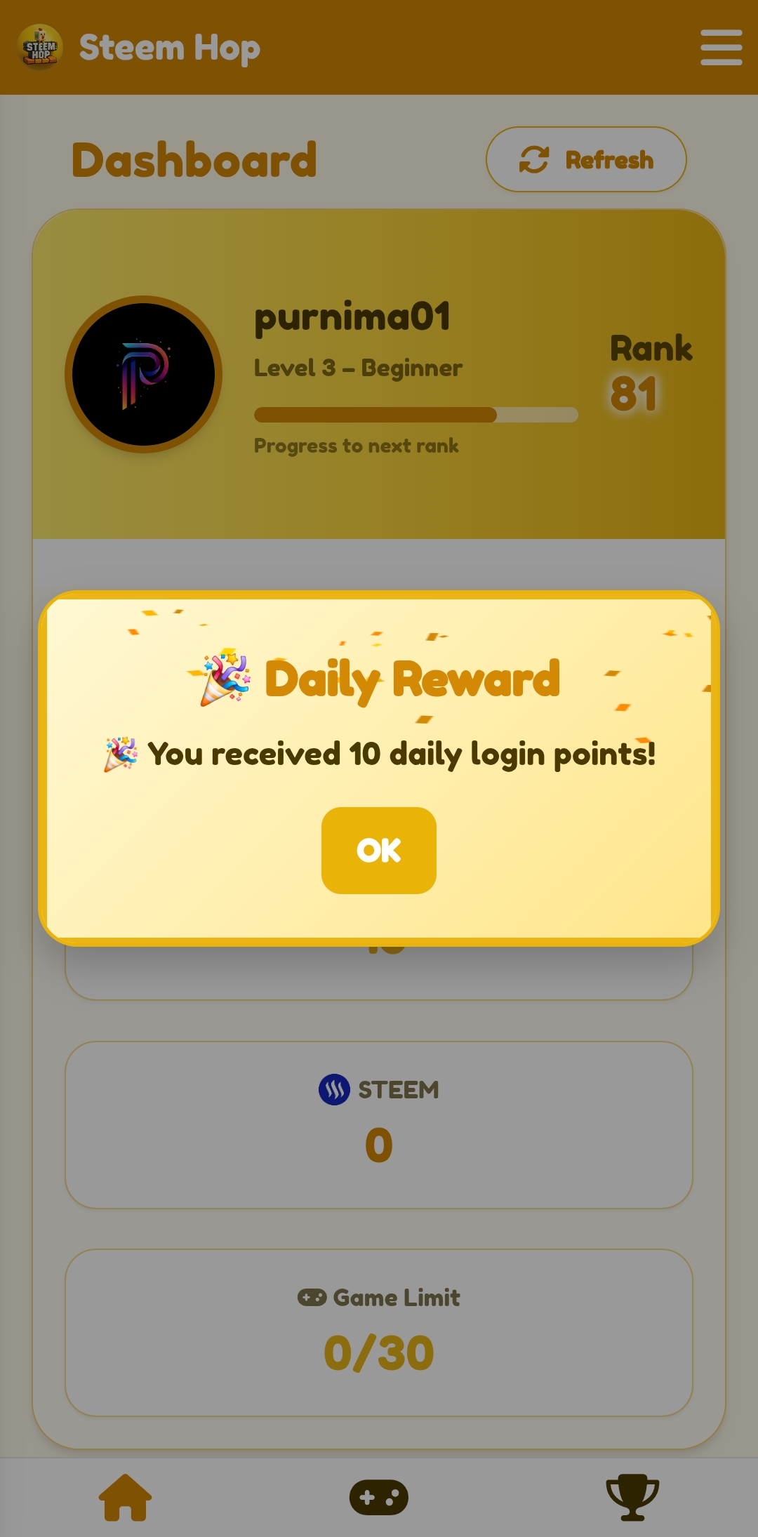Then I went to my dashboard. When I went to the dashboard, I saw that my level is three and I am showing as a beginner. In reality, I am a beginner. I do not have much experience in playing games. So I start from here, my rank is 81.