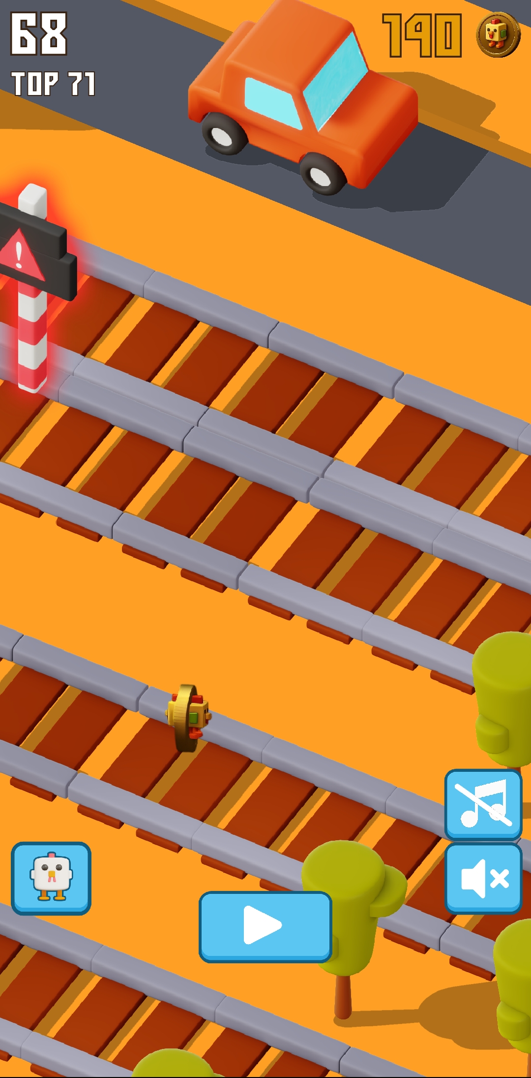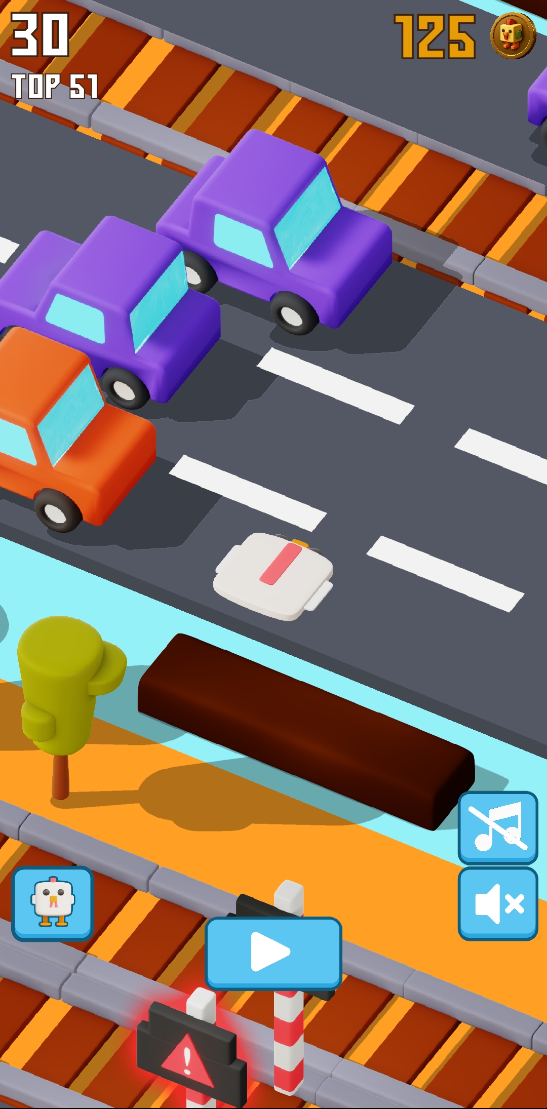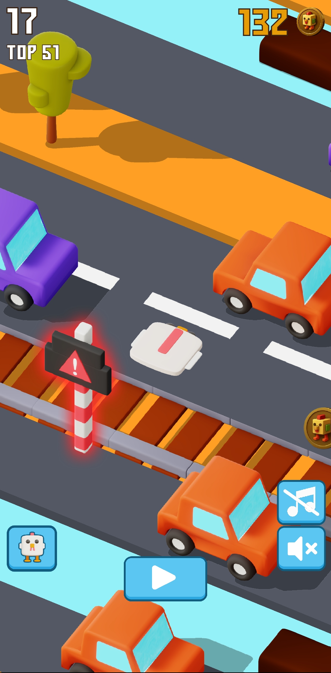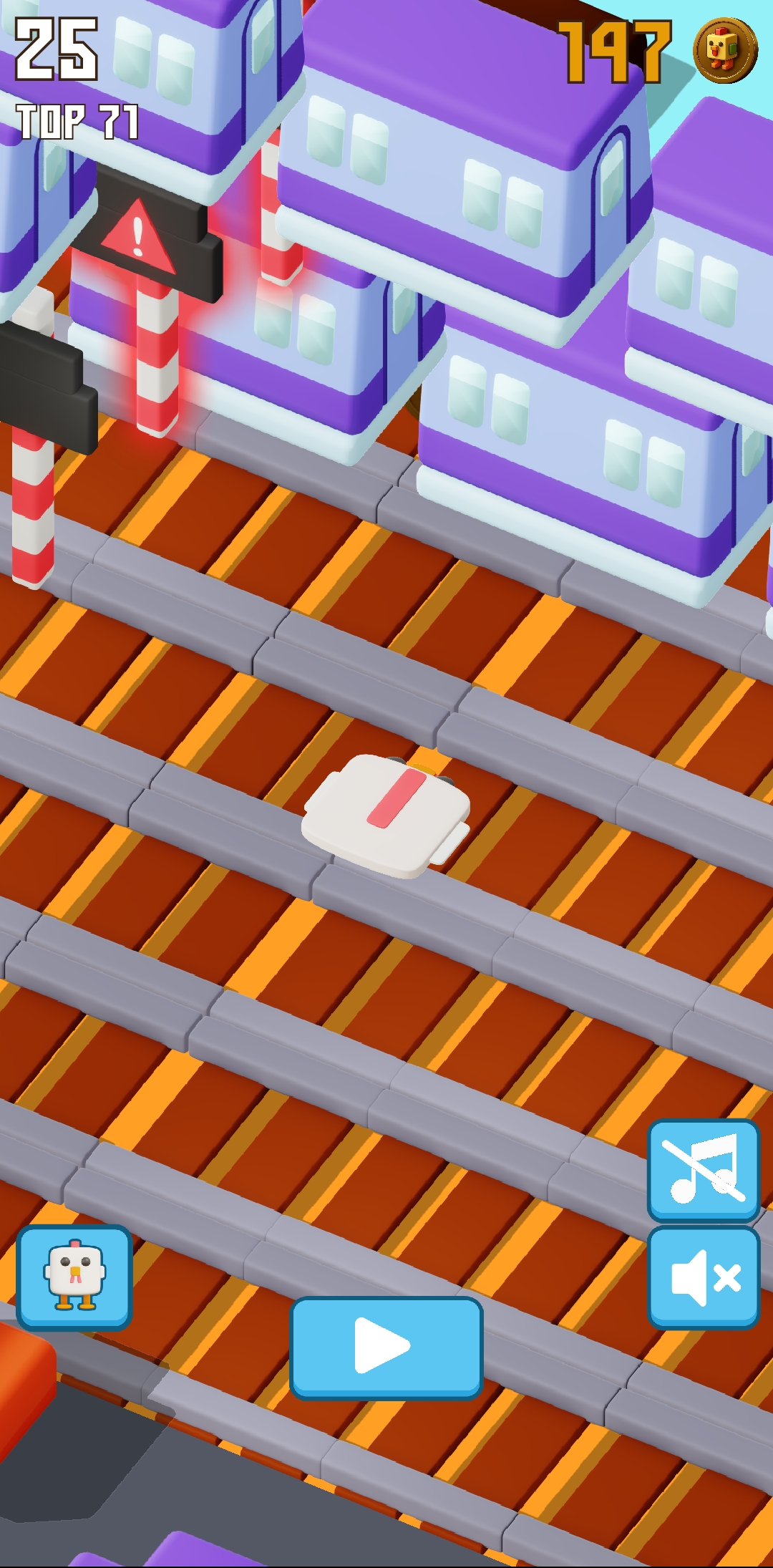 Then I kept playing again. Compared to the other times, I enjoyed playing this time a lot. This time I found about four rail crossings at once. So when I went to the middle of the rail crossings, I saw that every traffic light was showing red, meaning a train was coming here. So at this point I was out again. Here I was able to collect about 8 more points.