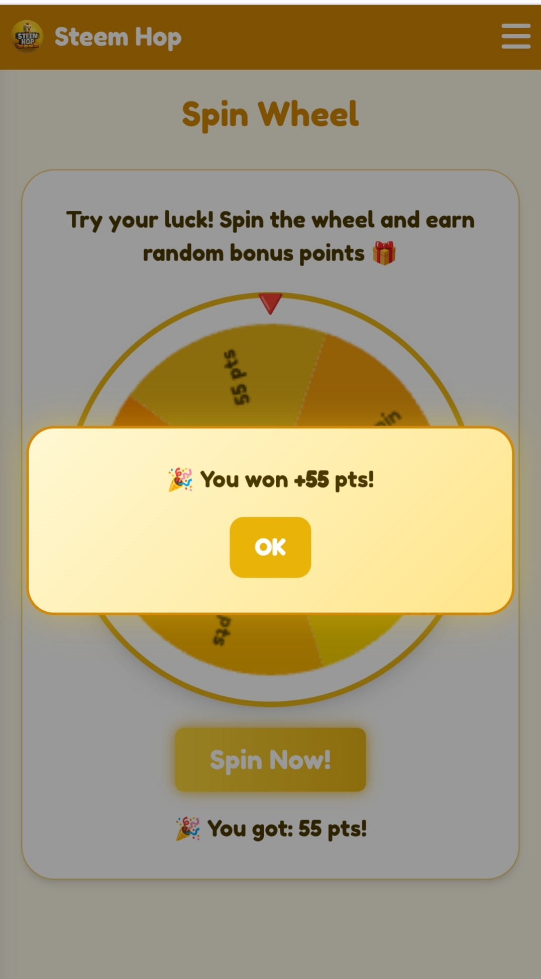 As soon as I pressed the spin wheel option, I got 55 points. These are very few points for me because here you can get maximum points and sometimes you can get zero points, but today I got very few points.