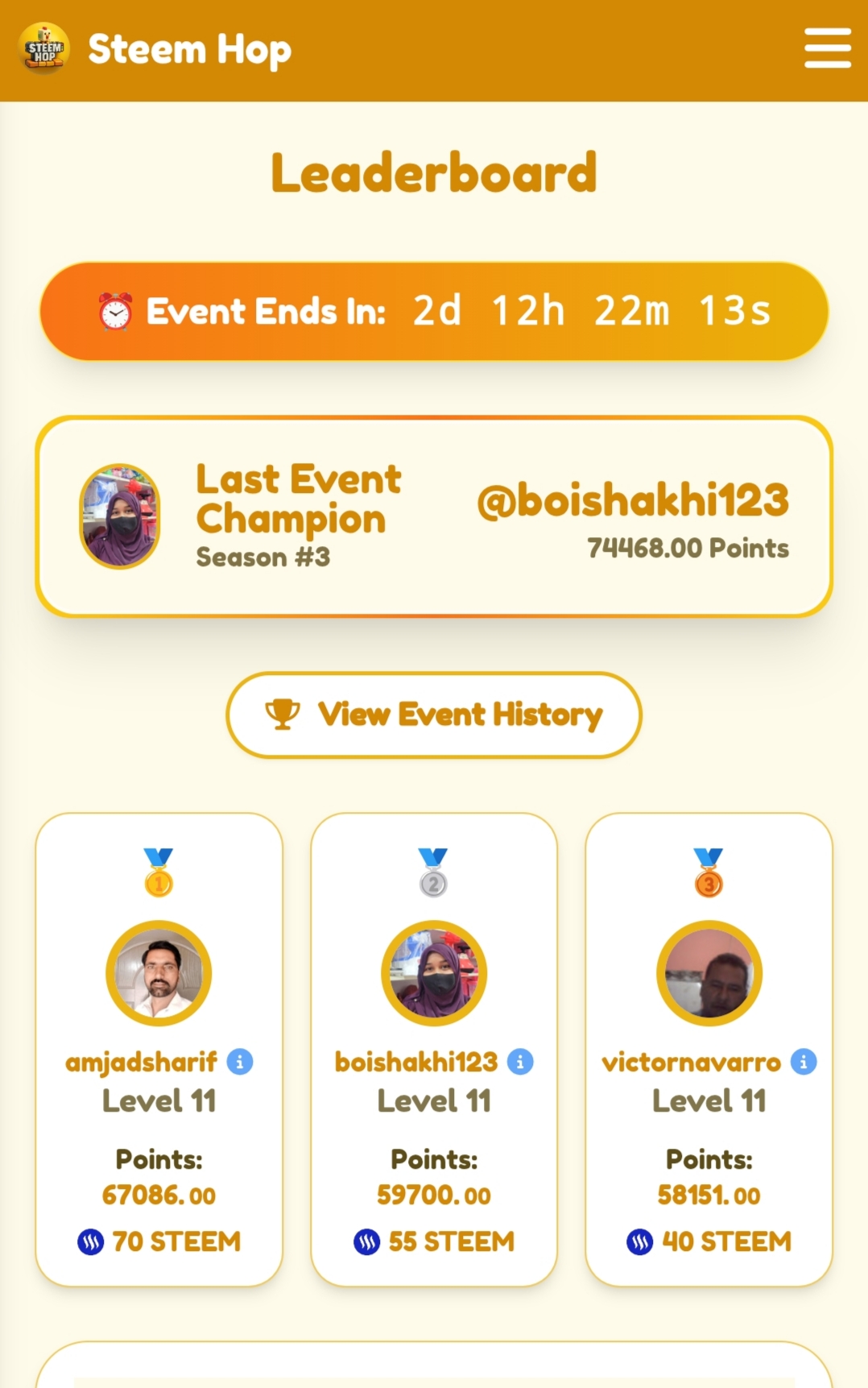 As you can see, this is the leaderboard and there are three people standing on the top and they have earned the most points. The first one has level 11, the second one has level 11, the third one has level 11. The first one has earned 70 steam, the second one has earned 55 steam, and the third one has earned