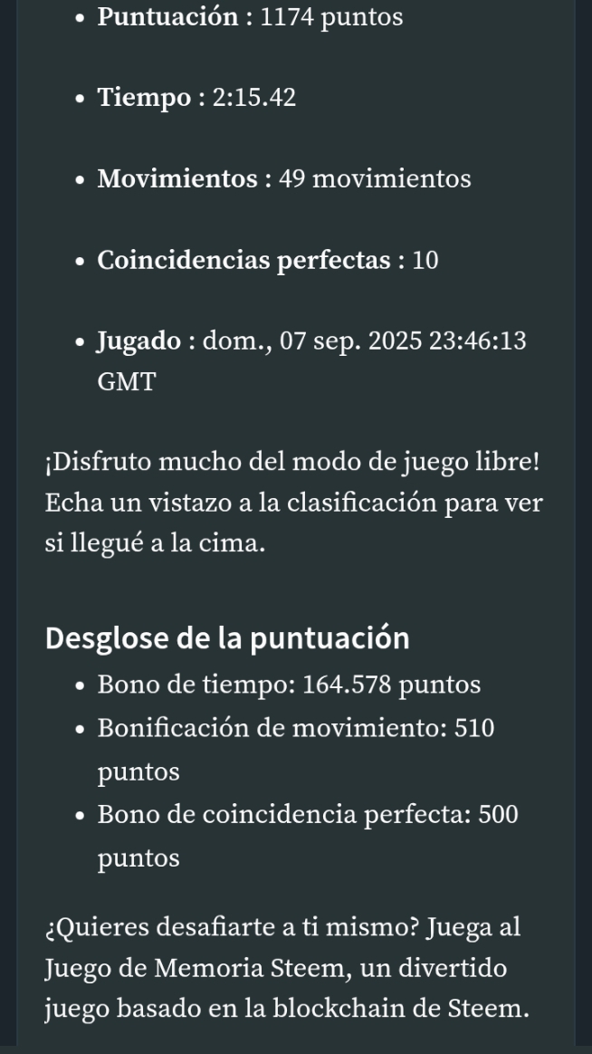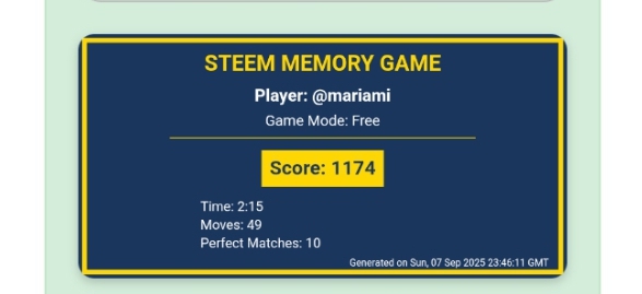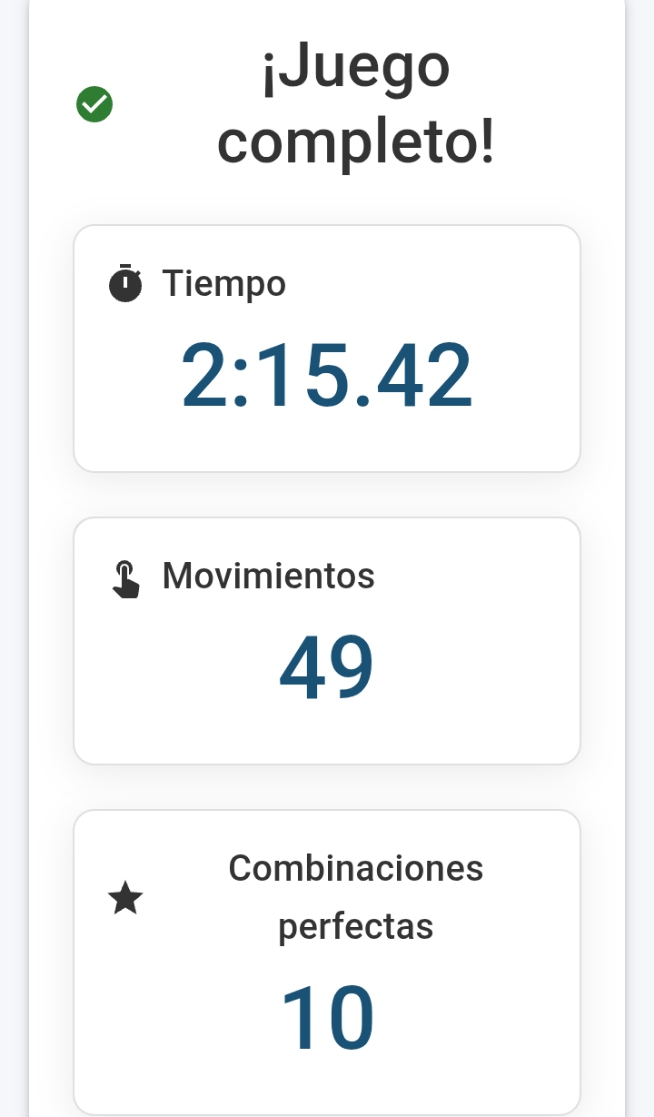 Fue otra grata experiencia jugando memoria en steemit, a pesar que retrocedi en mis logros de tiempo y movimientos no me desanimo, esto me enseñó a qué no podemos descuidar la práctica constante en cualquier actividad que hagamos, pues es esa práctica unida a la constancia y perseverancia quienes dan la victoria.