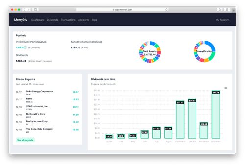 MerryDiv is a Dashboard for your dividends collecting all your stock insights under a single roof. It contains, diversification, dividends, stocks, everything.