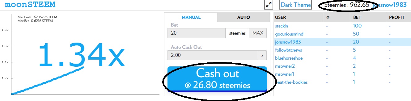 moonSTEEM is an easy to play crash game added on the steem ecosystem where you can multiply your steem 2x 3x 10x 20x 50x 100x 1000x ... MOON! If your lucky enough.