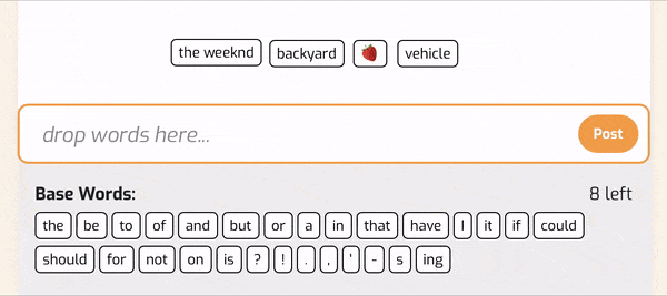 frij.io is a word game based on fridge magnet poetry! Challenge your creativity and wordsmith your way to the top of the leaderboard. A new word bank is generated everyday with plenty of nouns, verbs, adjectives and emojis to get funny fridge phrases flowing.
