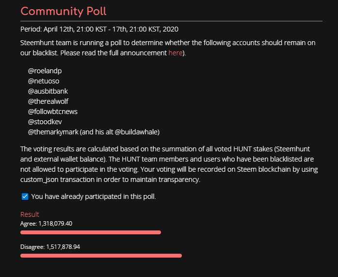 We will keep the accounts on, or remove them from the HUNT blacklist based on the results of this community poll. Please submit your opinion.