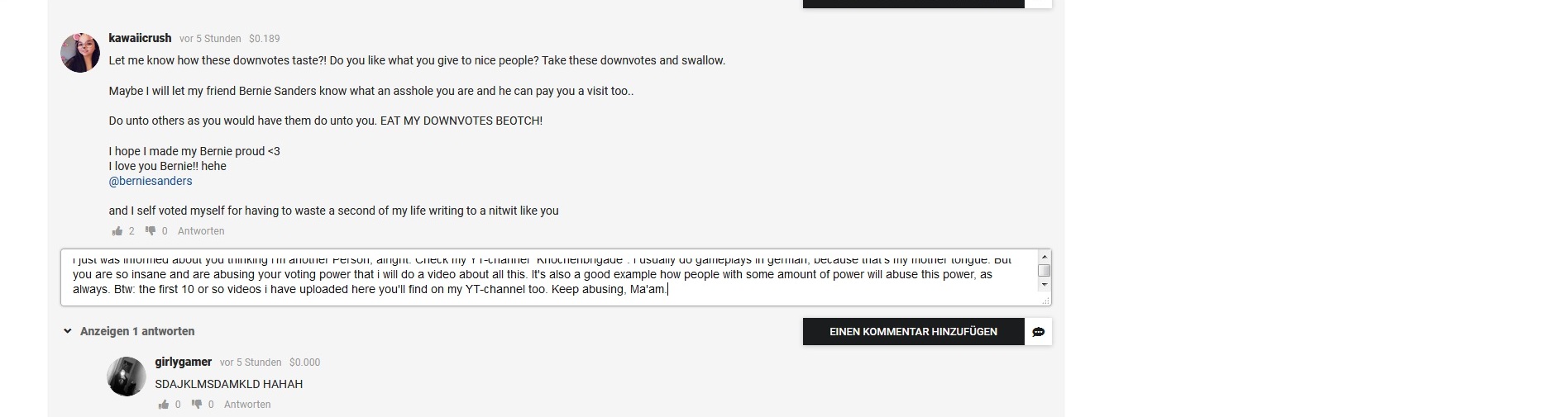 Not only does she think it's absolutely correct what she did, under a completely false assumption (i just gave one simple downvote which had no effect at all, not leaving a comment. Stuff that happens here and on YT all the time. The thumbs down button is there for a reason.), but also she threatened to send other people she's good with and have more voting power to downvote videos into the abyss. FEELS LIKE YOUTUBE HERE!