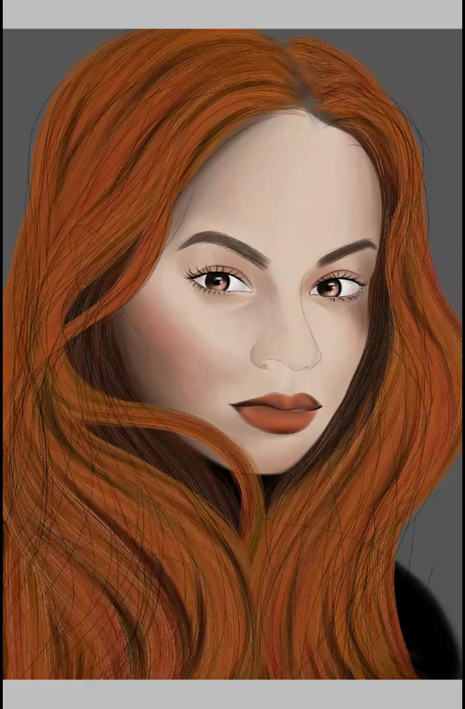 Para ese voluminoso cabello, usé los pinceles, óleo cabello, cabello claro y pluma fuerte, inicialmente lo creé con colores naranja para luego escoger el tono de color de mi preferencia: