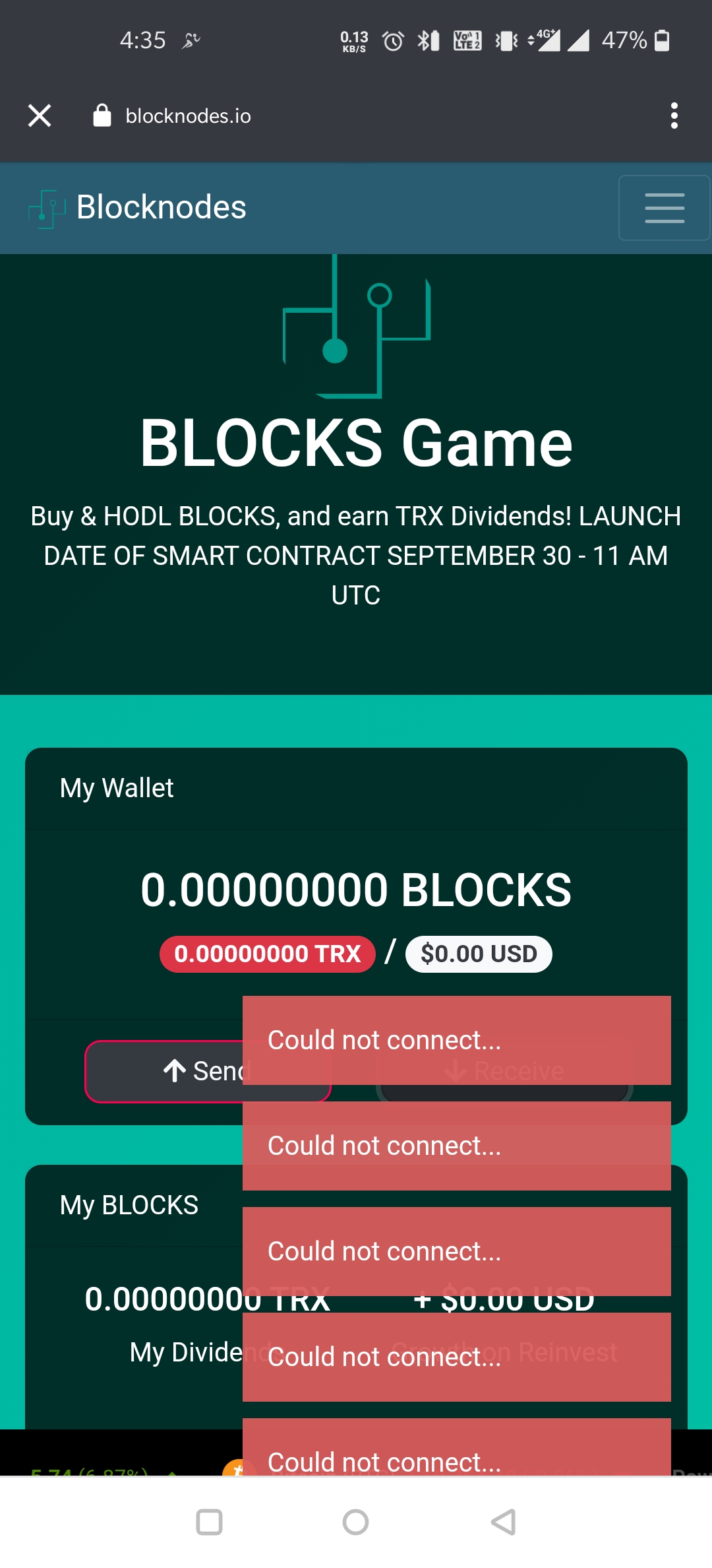 Our website can only speak with Tronlink. This is the main wallet of the Tron network and can be safely downloaded here. Available on IOS, Android, or as a chrome extension. Create a wallet and top it up with some TRX!Buy Some Blocks