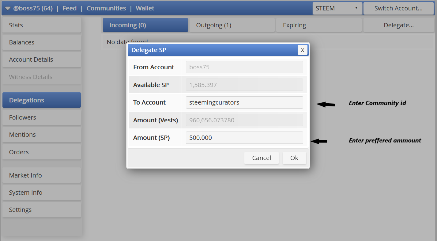 How to delegate to @steemingcurators Community account
