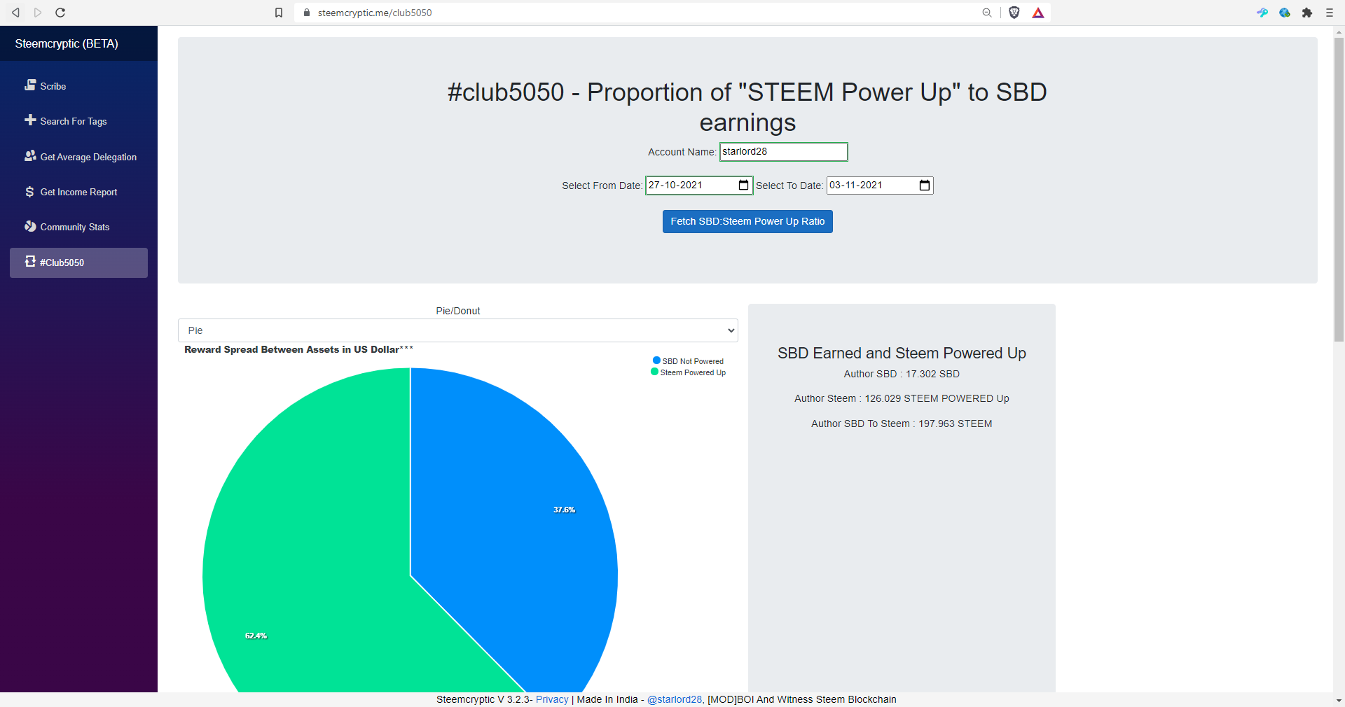 The #club5050 tool always showed the percentage of Steem powered up to the percentage that was not powered up in USD value all this time. Since the native token of Steem blockchain is Steem, I decided to add an additional spread that shows the reward distribution based on the amount of Steem powered up.