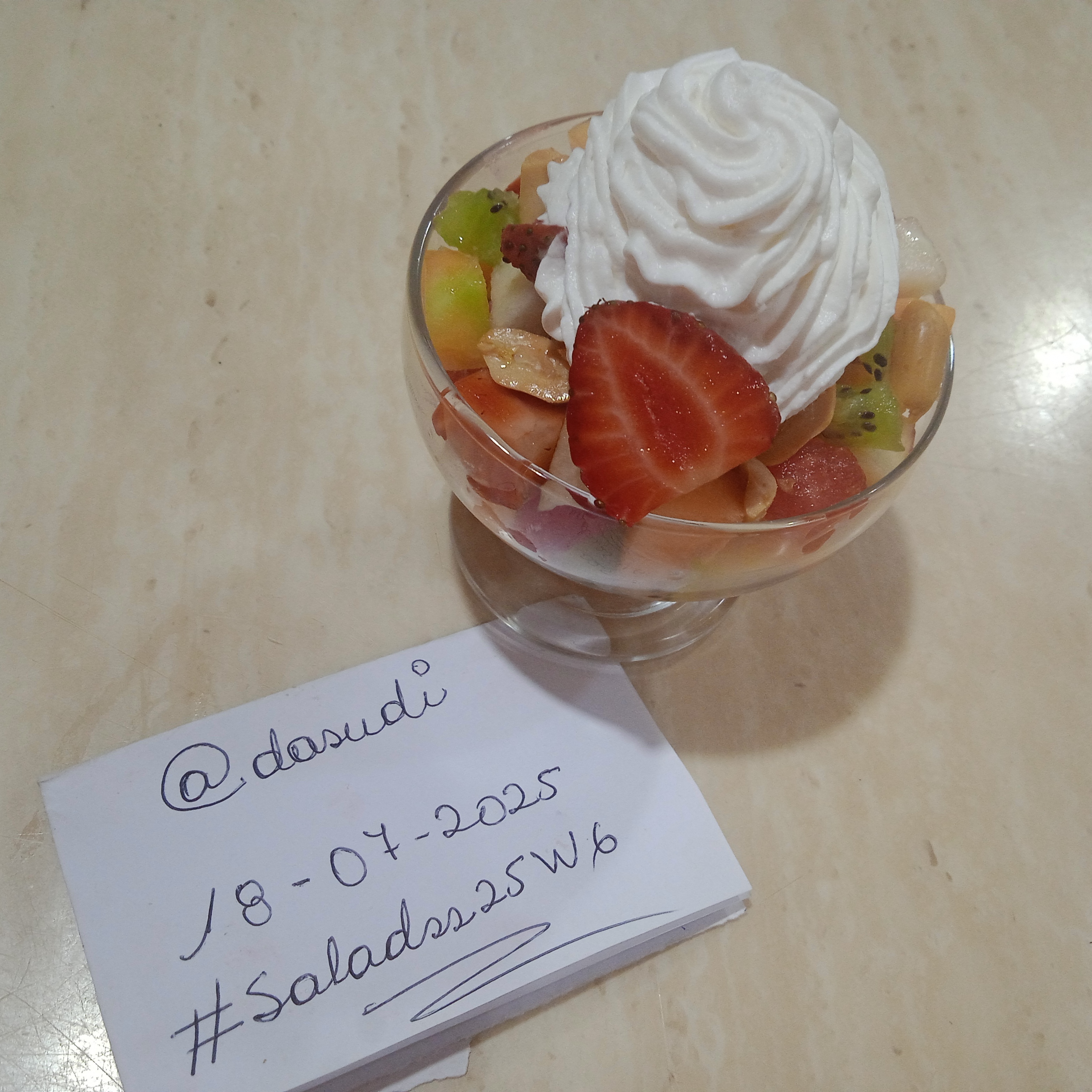 Incluir un cartel de identificación manuscrito, junto a su Ensalada de Frutas, que contenga nombre de usuario y fecha y la etiqueta #saladss25w6