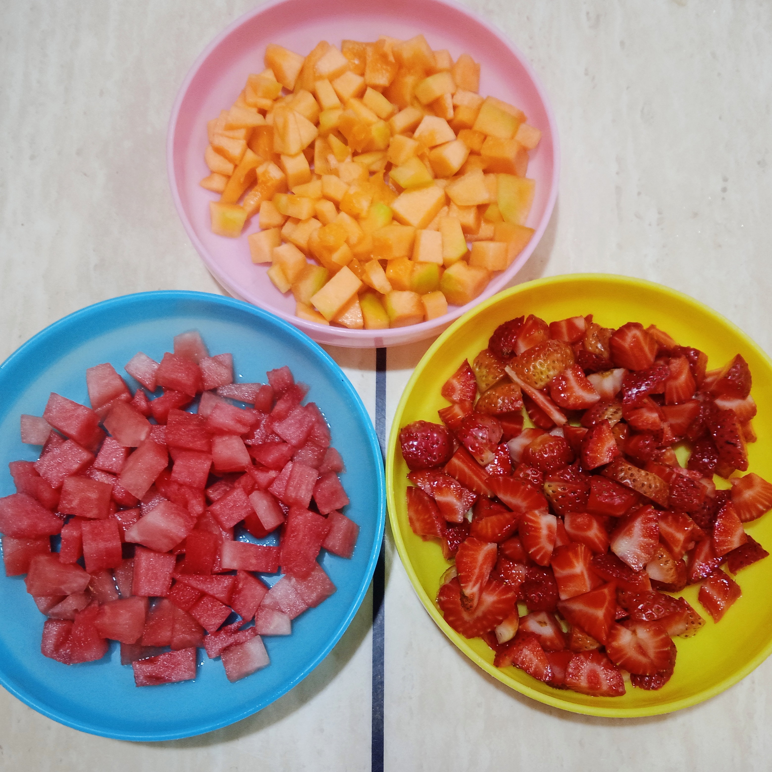 ✓ Cortamos cada una de nuestras frutas; procura realizar cortes del mismo tamaño. Aquí puedes jugar con la creatividad y utilizar cortadores.