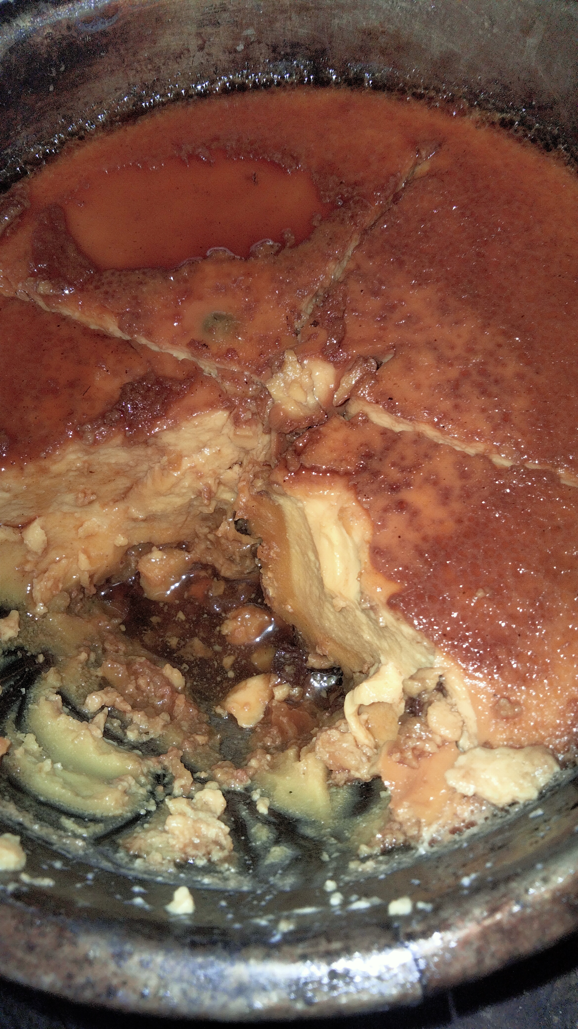 I prepared caramel by heating 200g of sugar.Caramel was put in a container and let it cool down.After cooling down, I poured the pudding mixture over caramel.