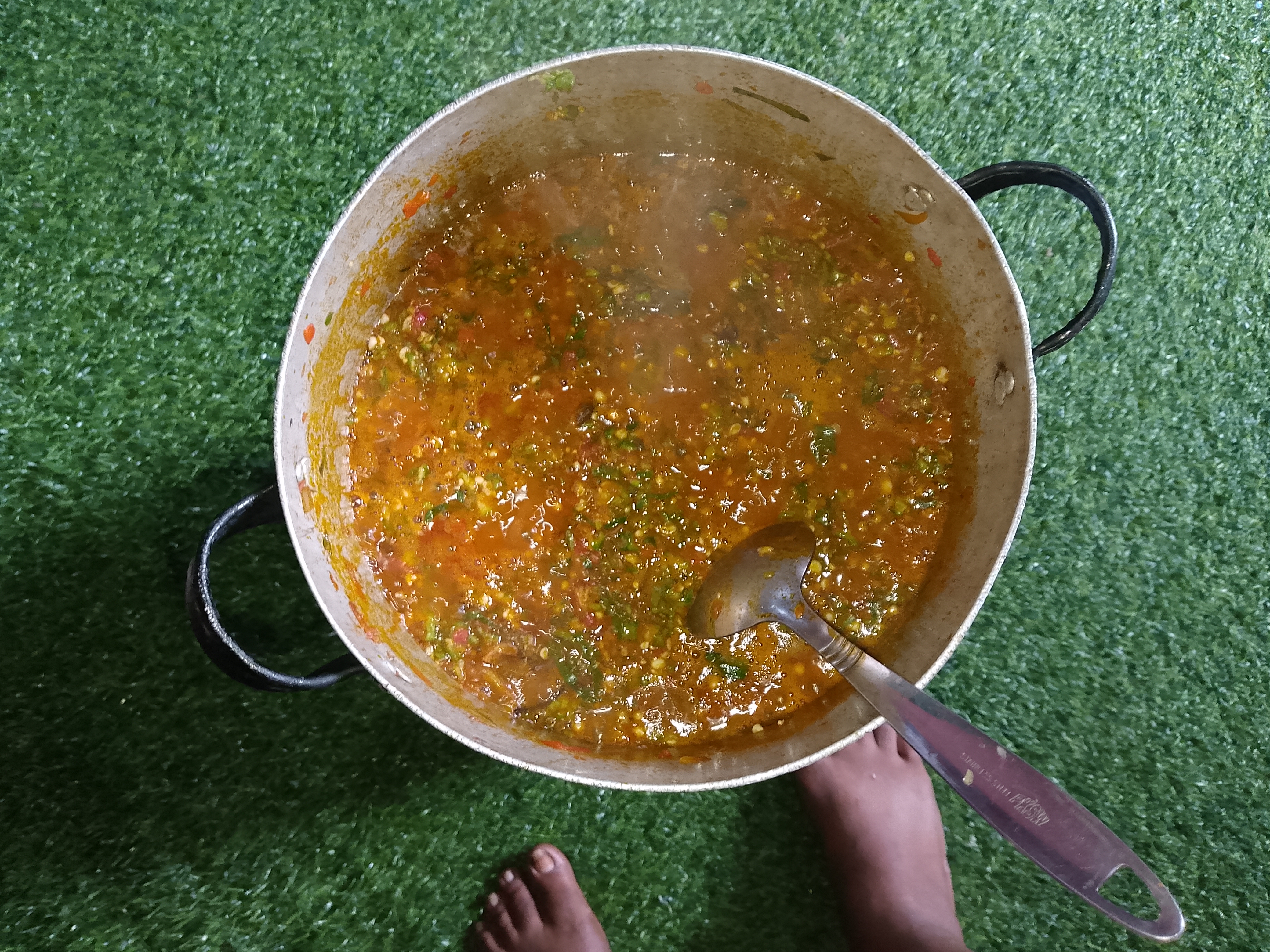 Pour in a preferable quantity of oil depending on your likes and add little quantity of diced onion if you like it in your soup.
